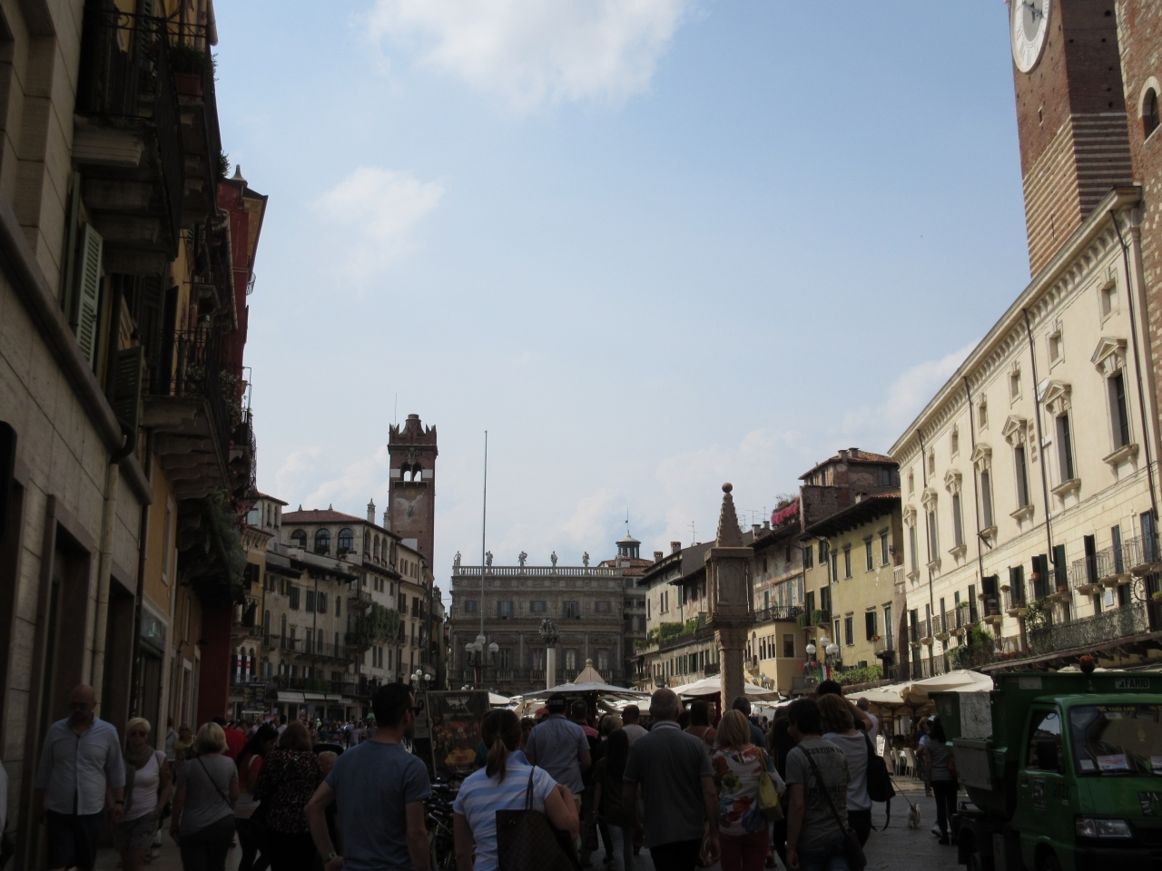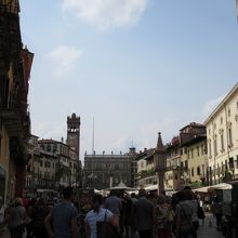 ジュリエットの家からアレーナに戻る道を左折せずに真っすぐ進むとエルベ広場に出る。市場が開かれていてたくさんのパラソルが広げられ、買い物に大勢の人が来ている。広場を囲む建物は中世からルネッサンス期に建てられたもので、違う時代に来たような感じにさせられた。