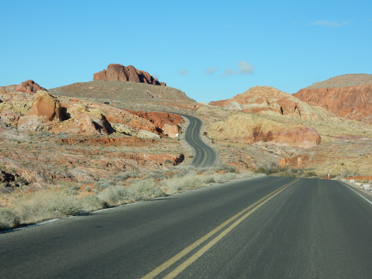 ラスベガス側から来ると、入口手前の下り坂でオレンジ色の岩が見えてきます。