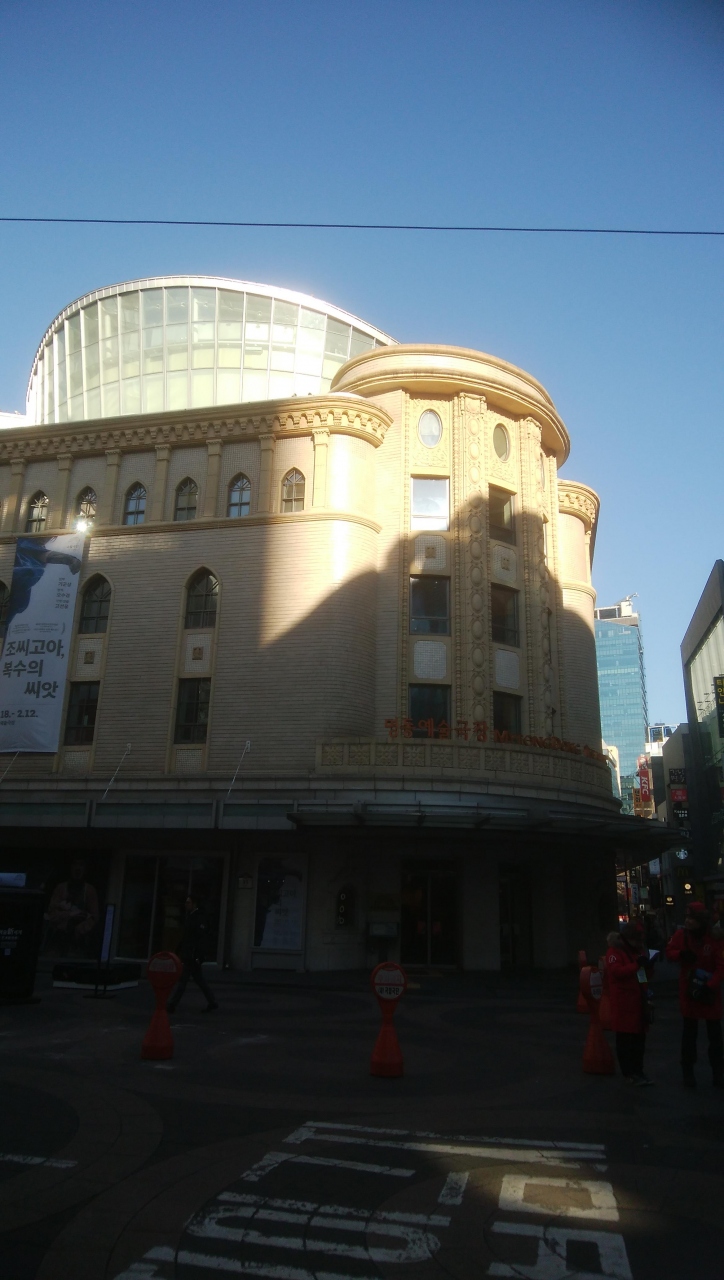 地下鉄4号線の明洞駅か2号線の乙支路入口駅からは街の中心に向かっていくと現れます。明洞駅の6番出口からはまっすぐ北に向かって一本道です。近代的なファッションビルやレストラン、コスメ店などが軒を並べているなかで、突然異彩を放つ形であるビルでインパクト満点です。ここは日本統治時代の戦前は旧明治座であって、戦後は国立劇場として運営されていて、その後はこの建物の外壁を残して明洞芸術劇場になった歴史がある、近代建築の建物としても価値があるのがよくわかります。一見の価値ありです。