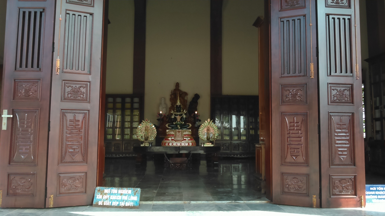 ツアーで訪問しました。遠くからでも白い観音様が見えています。東京湾観音のようです。このお寺は小高い丘にあり、海を見下ろすこともできます。布袋様のような白い羅漢さんが、左右に整列しており、横には鼎も並んでいます。