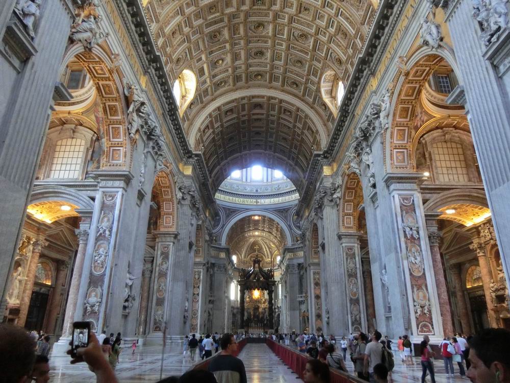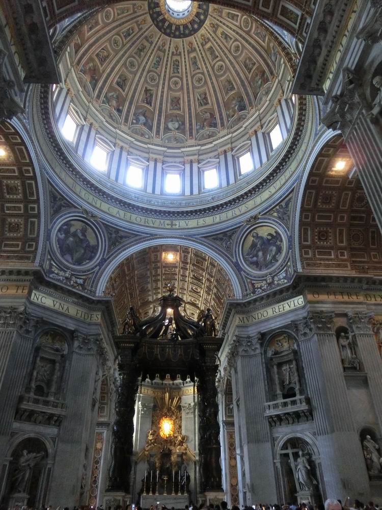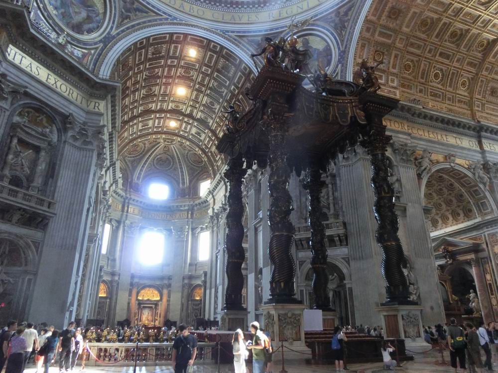 サンピエトロ大聖堂の中央奥に位置する青銅製の天蓋がバルダッキーノ。ベルニーニによる設計で1633年に完成。ねじれたような柱のデザインが特長です。イエスの弟子である聖ペテロの墓の上に建っており、大聖堂の中でも特別重要な場所であることが分かります。