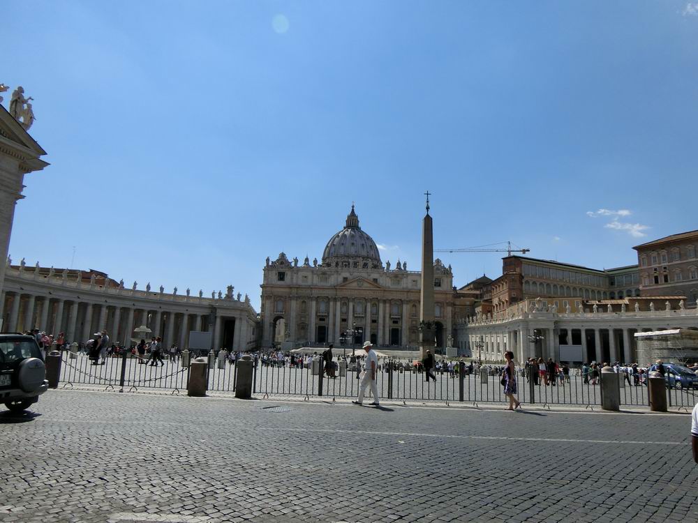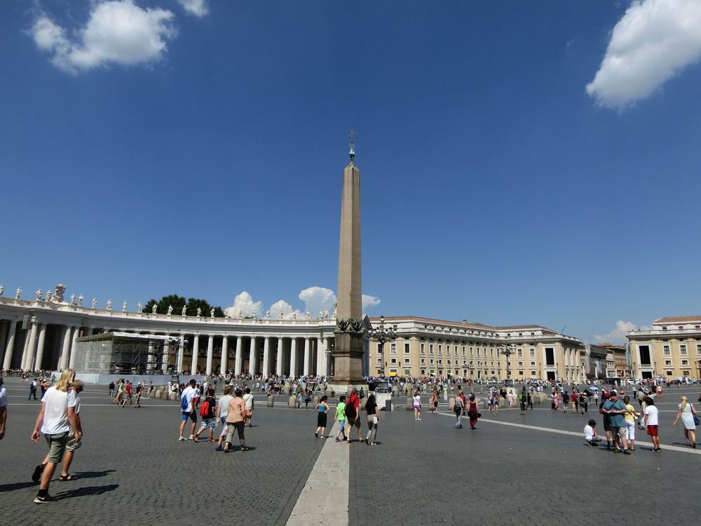 サンピエトロ大聖堂前の広場。楕円形の広場の中央にオベリスクが建ち、広場を囲む柱廊の屋根には聖人像がずらーっと140体も並んでいて壮観です。写真でよく見かける椅子が並んでいる状態ではなく、すっきりとしていました。特定の場所に立つと4列の円柱が重なって広場の外が見えるしかけになっています。オベリスクと2つの噴水、それぞれの中間の足元に目印があります。
