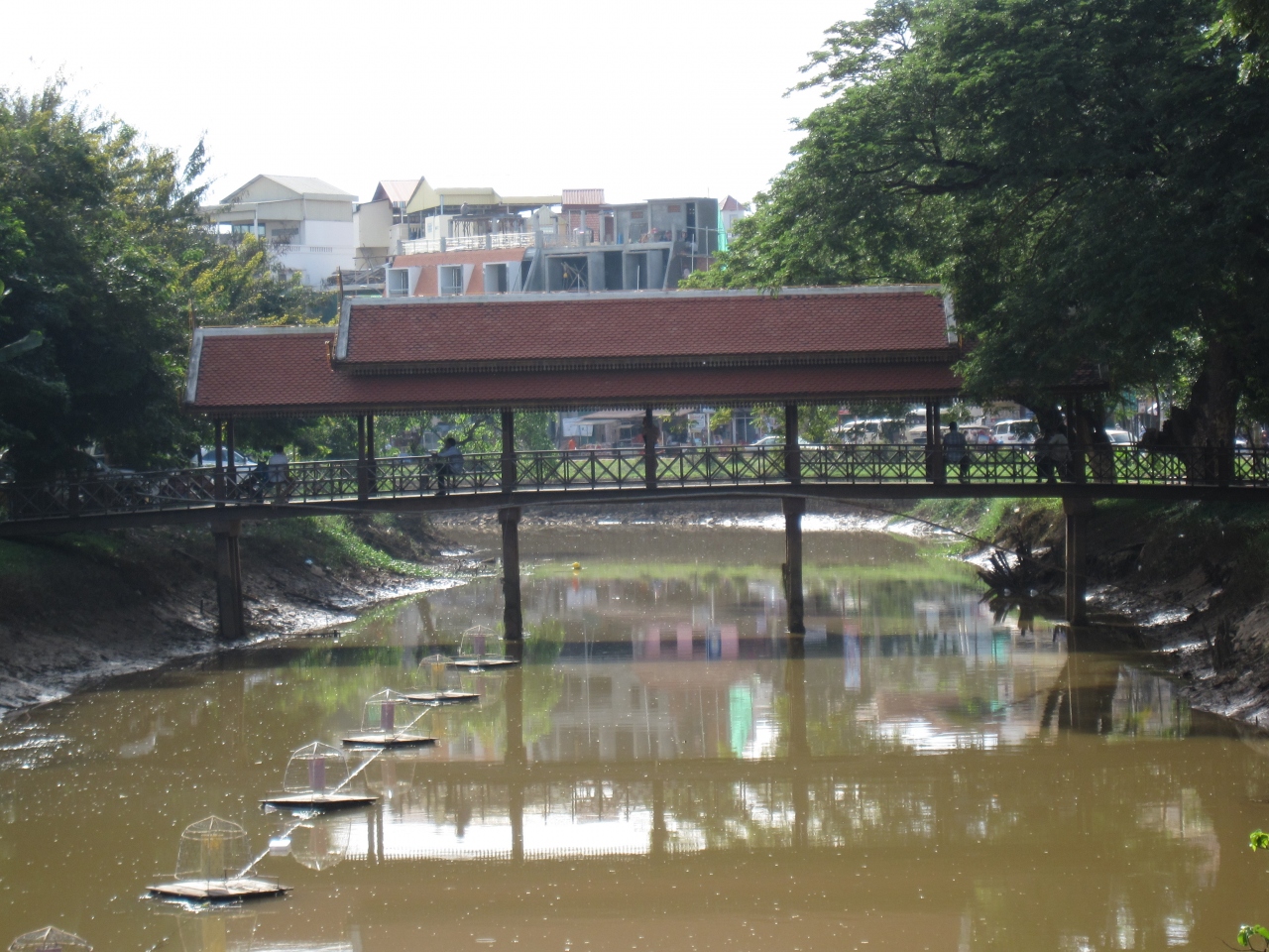 シュムリアップ中心部を流れる川ですが、特徴ある橋が2つありこの両岸に店舗や観光客が集中しています。国道6号線からみると右側の賑やかさに比べると、左側は寂れた感じがします。街中の喧騒から逃れて川沿いに並ぶベンチで休憩するには丁度よい場所でもあります。ただし、いかがわしい人やツクツク運転者の強烈な勧誘がありますのでご注意ください。