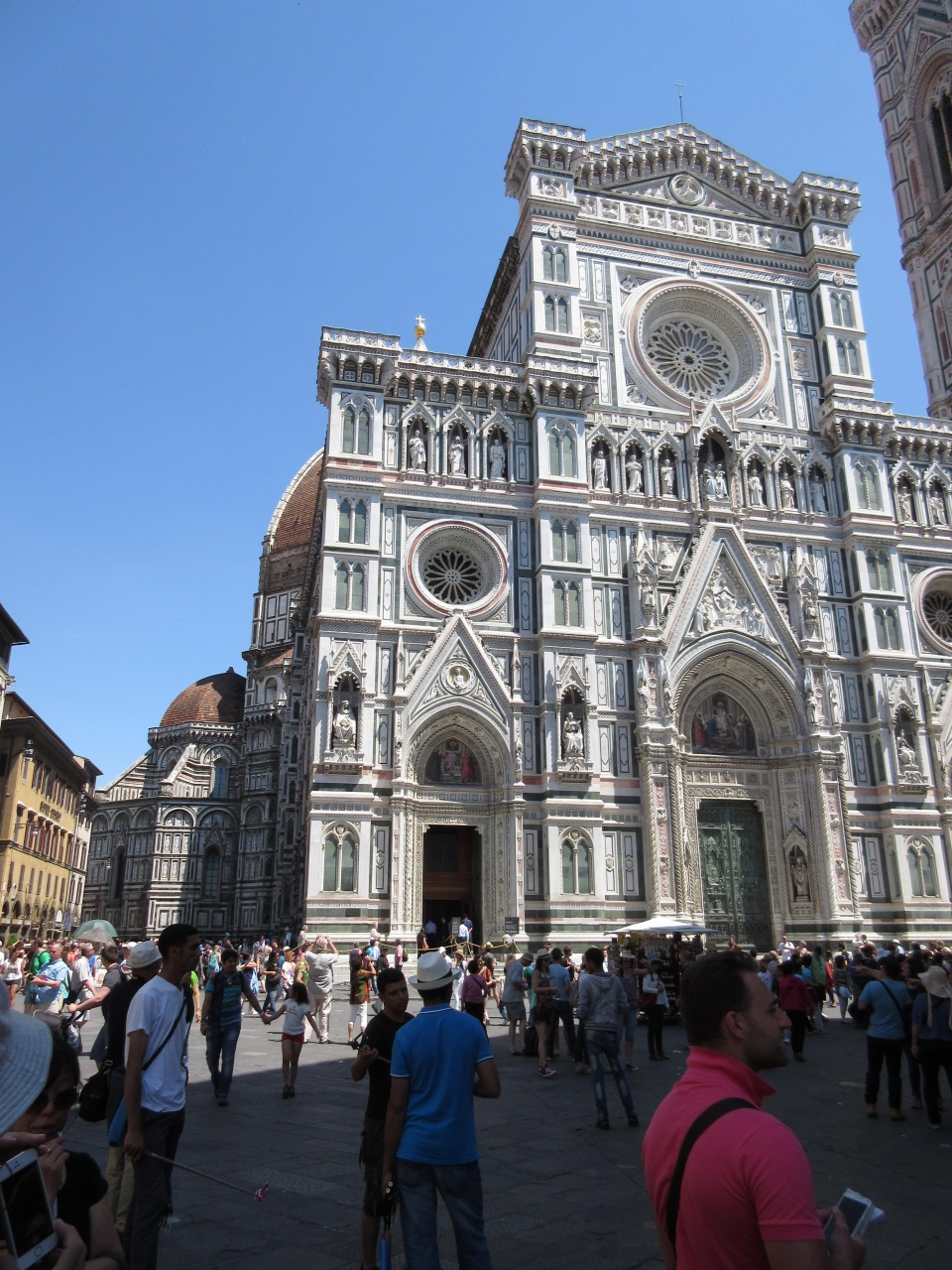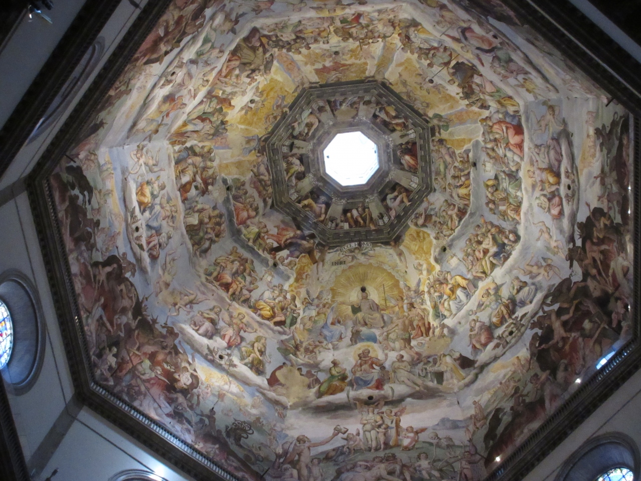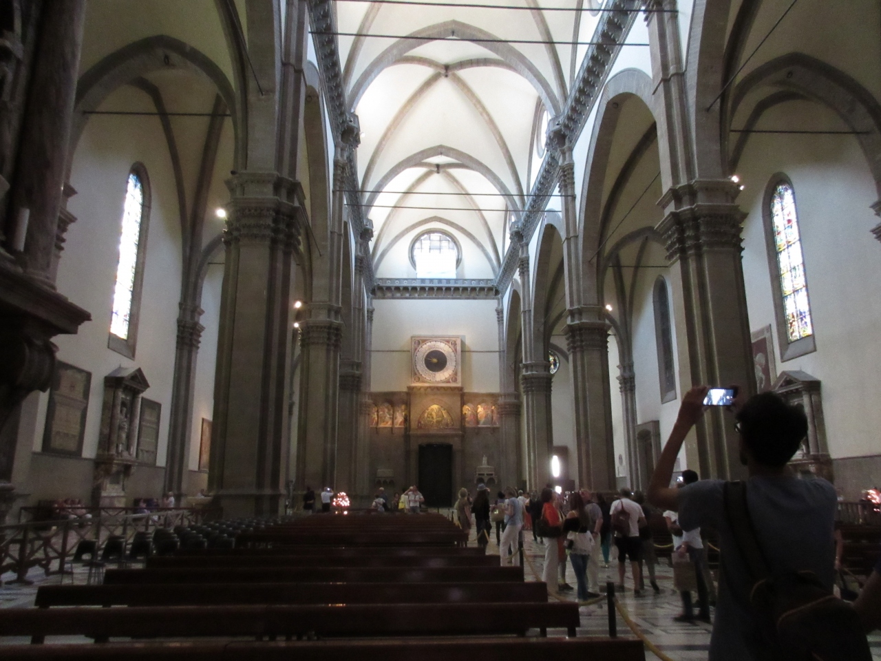 1296年から172年かかって建築された。ゴシック様式で初期ルネサンス建築を代表する建物である。白を基調として緑とピンクの花の色の大理石で装飾されているので花の聖母と言われるのではないかと思う。当時の技術ではクーポラを築くのに足場と仮枠を作ることが困難であり、二重構造にしている。約3万人が一堂に会することができるという。確かに大きなクーポラである。