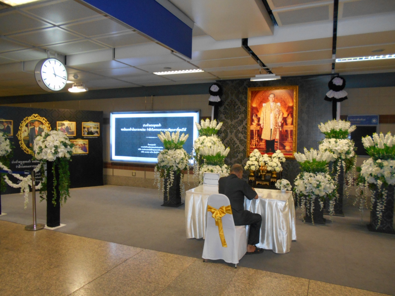 地下鉄のファランポーン駅は鉄道駅と連絡通路でつながっています。 この連絡通路には王室関係の展示があり、記念の椅子などが並んでいます。 国王が亡くなられたので、大きな遺影は白い花で飾られ、その前には記帳台が設置されていました。