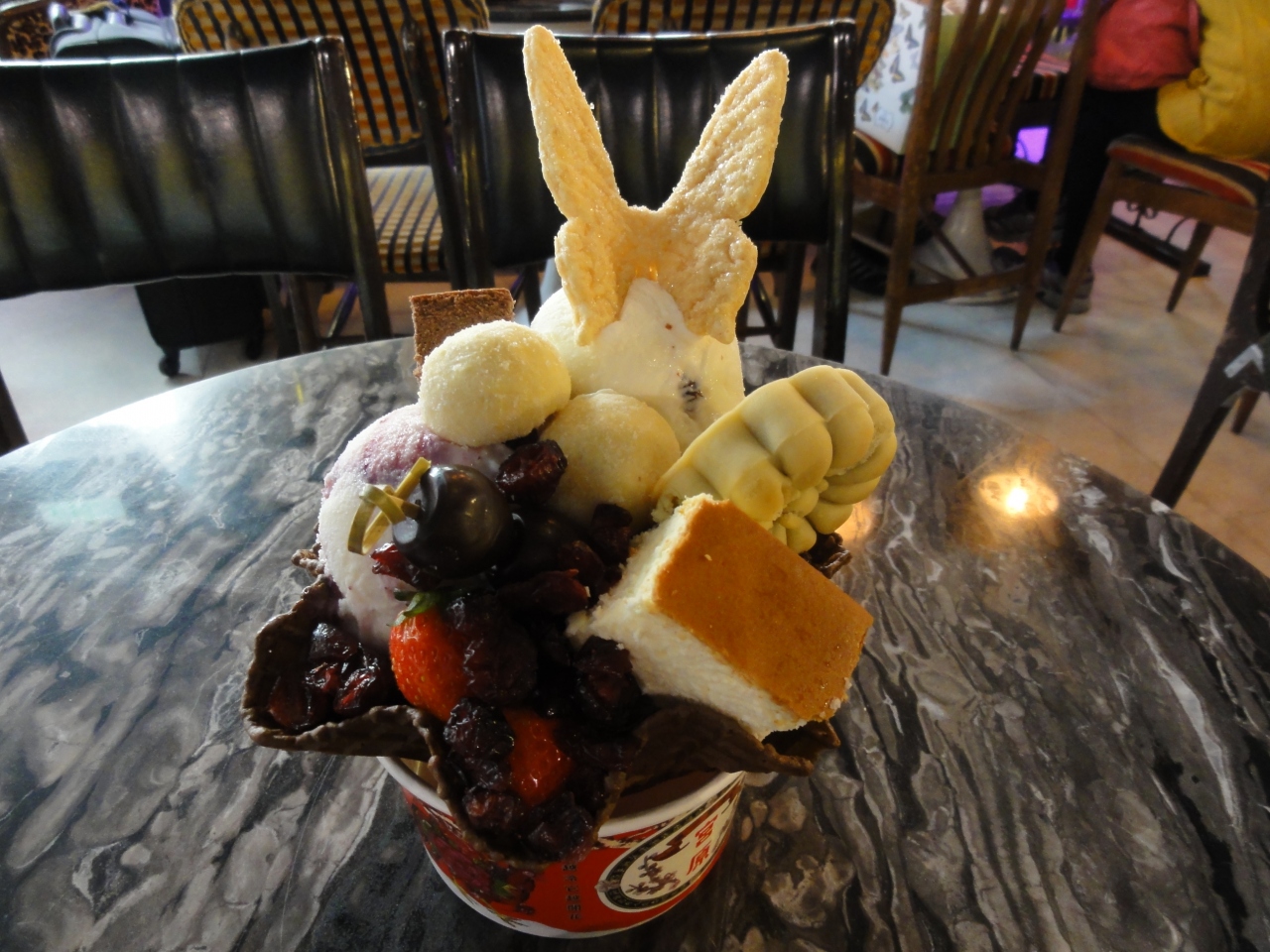 アイスクリームを食べに行きました。宮原眼科に比べるとすいていてすぐに注文できました。種類が多いので色々食べたいからトリプルを注文。プラス80元のスペシャルトッピングをお勧めされ、せっかくなのでお願いし、テイクアウトに売られているチーズケーキや菊の形のお菓子等のトッピングをしてもらいました。日本円で1,000円を超えますが、ボリュームもあり色々味見ができて満足できるでアイスでした。