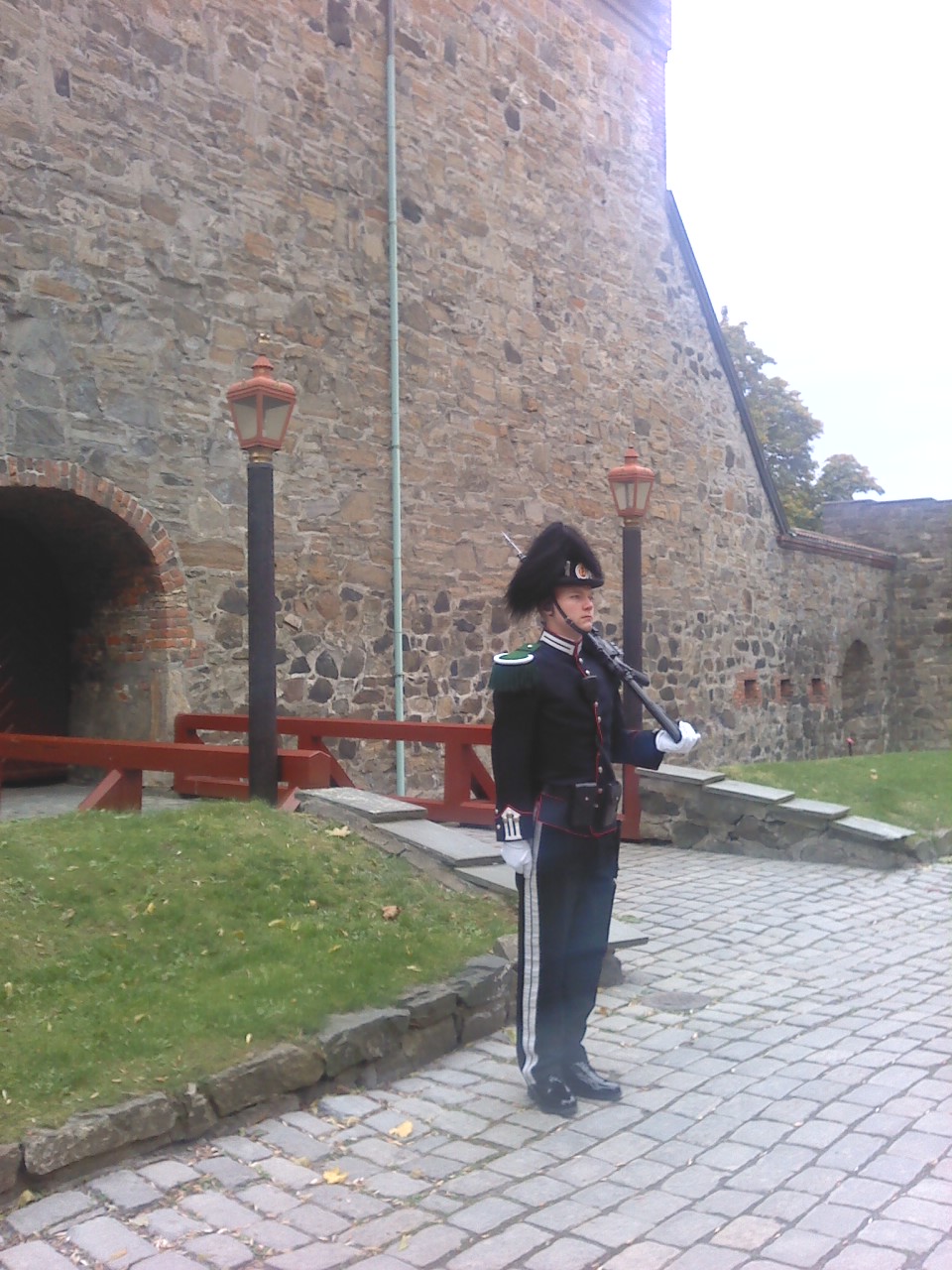 私は歩いていきました。お城自体は小さめですが、独特で、これがノルウェーらしいのでしょうね。入口の所には、ちゃんと兵隊が1人、立っていました。