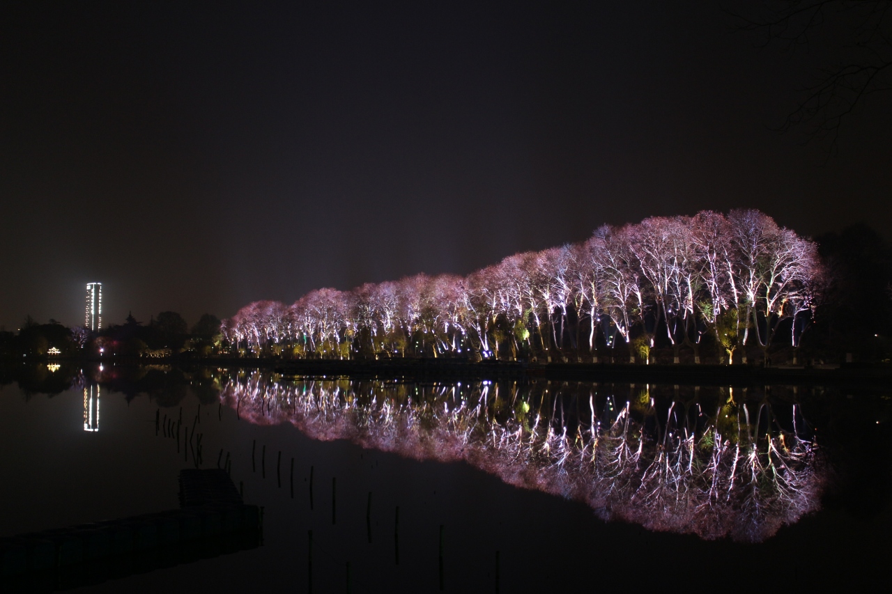 昼間、周囲の城壁の上を歩いたのですが、夜の玄武門のライトアップを見ようと再訪すると、遊歩道沿いの木々がライトアップされており、予想外にきれいでした。