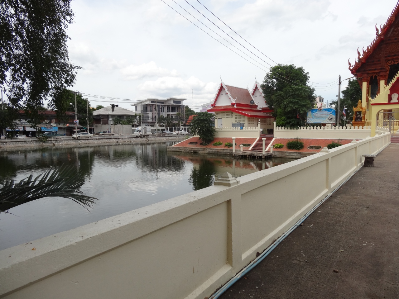 コラートの中心部にもほど近い場所にある寺院です。比較的広い内部は、屋台のお店もあるにはあるけど、誰もいなくて、店員までいないという感じです。広い池があって、そこに浮かぶような形で本堂がありますが、フェンスにはかぎが掛かっていました。寺院内は静かなので、散策にもいいですね。コラートでは有名な寺院なので、散歩がてら立ち寄るのがいいかな?と思います。