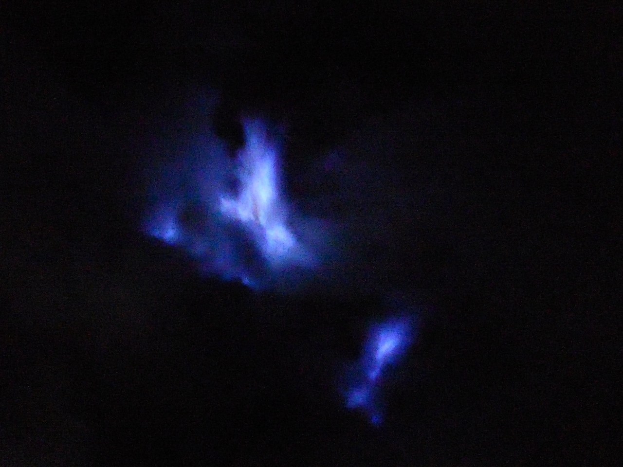 3分の1ぐらいおりると、青い光が見えはじめて来ました。「Blue Fire見れたしもういいやん」という心の声を振り払い、さらにぐねぐねと道無き道を降りていくと、硫黄の臭いがどんどん強くなり、ヤバイ感じに。それでもなんとか、青い光のすぐ近くまで辿りつきました。幻想的な青い炎は刻一刻と形を変え、生で見ると想像以上の迫力です。風向きが変わると、硫黄の煙に巻き込まれそうになり、場所を変えたりしてblue fireを堪能。写真はチョット離れたところからの方がキレイにとれました。グループのガイドさんが呼んでいる声が聞こえたのでそちらにいって見ましたが、煙と暗さでわからなくなり結局合流できませんでした。あんまり堪能しすぎて、ツアーバスに乗り遅れては大変なので火口から出発。この頃になると降りて来た時よりかなり明るくなっていて、懐中電灯はいらなくなっていました。