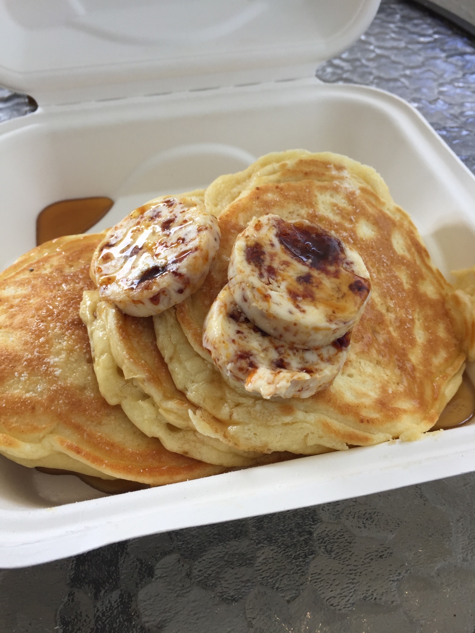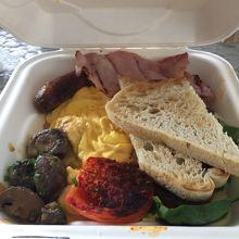 お店は広くてとても雰囲気がよかったのですが、待ち時間が長くなるのでリコッタパンケーキとフルオージー(スクランブルエッグ・ソーセージ・ベーコン・トースト・トマト・マッシュルーム)を持ち帰りしました。日本人のスタッフさんがいたので注文もスムーズでした。