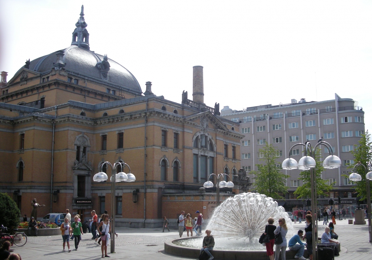 オスロの国立劇場は黄色い外壁が目立つ大きな建物です。国立劇場の前に公園があって、翼を広げたクジャクのように見えるユニークな噴水があり、噴水の周りに数人が座ってくつろいでいました。王宮の敷地を出てすぐのところにあり、王宮周辺を見学して休憩したい時にはこの公園でくつろぐといいでしょう。