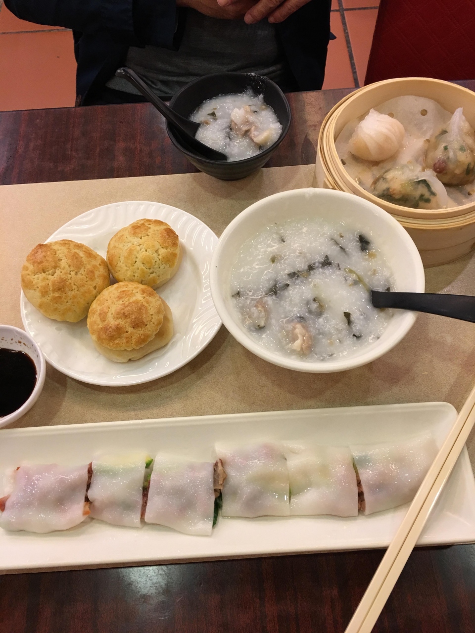 でも、量がわからず頼みすぎました。どれもとてもおいしかったです。特に、チャーシューメロンパンにはびっくり。クッキー地とチャーシュー、合います。おいしかったです。香港の粥も初めてでした。たかがお粥と思ってましたが、こちらも想像と違い、おいしかったです。