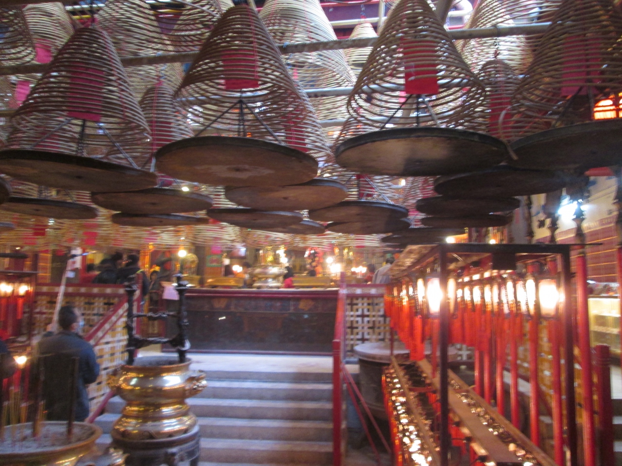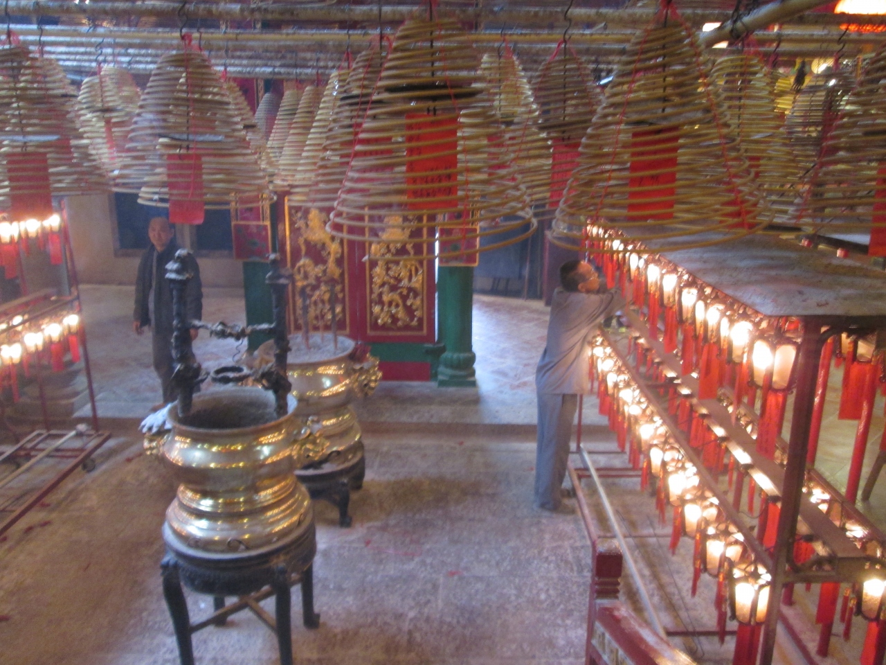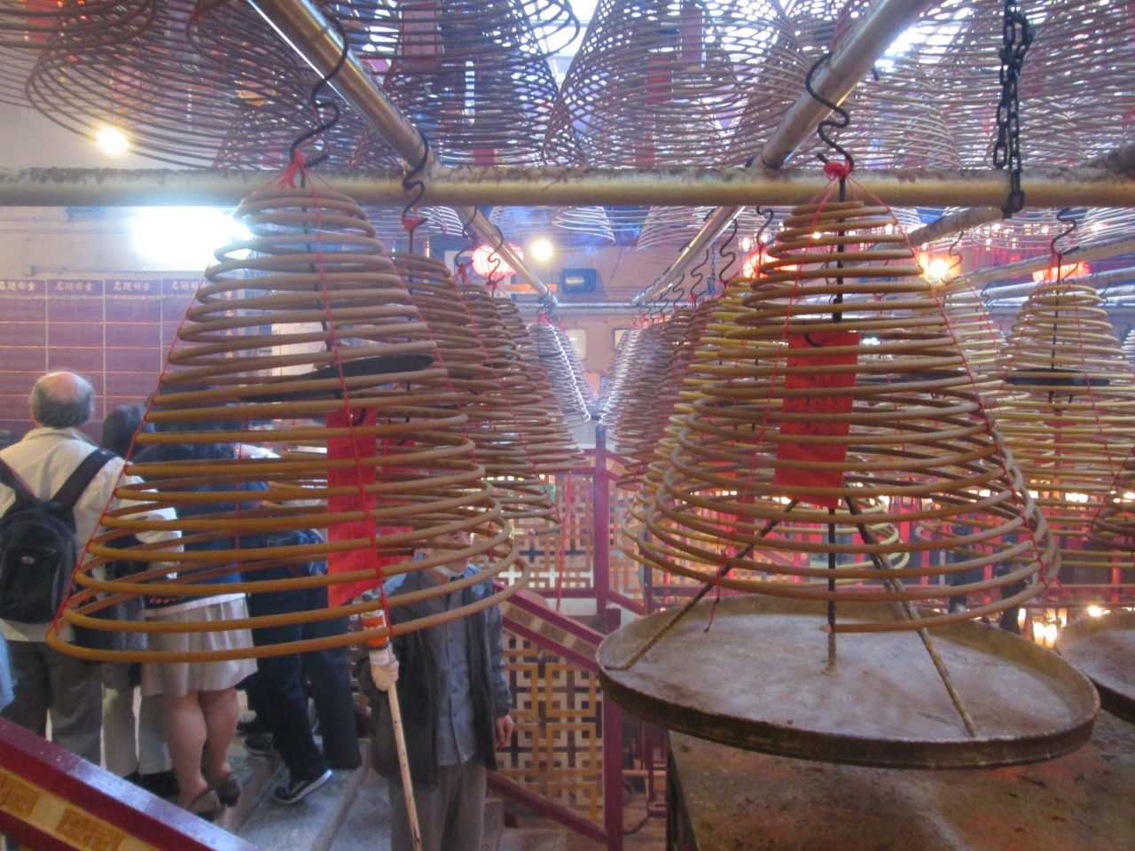 文武廟のなかに入ると中国らしい渦巻き線香が天井からぶら下がっていました。学問の神様と武道の神様が祀られている神への敬意を表するためのお清めの意味と、煙を絶やさないことで神への思いを絶やさないようにとの意味で線香を火はずっと付いたままになっていました。