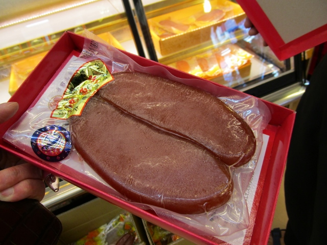 多少縮んだりして、風味も変わります。それで、今回は迪化街で唯一「泰」のカラスミを販売している永利行、自社でカラスミを作り、迪化街の他のお店にも卸している聯成食品行で購入。冷蔵品で、どちらもおいしかったです。