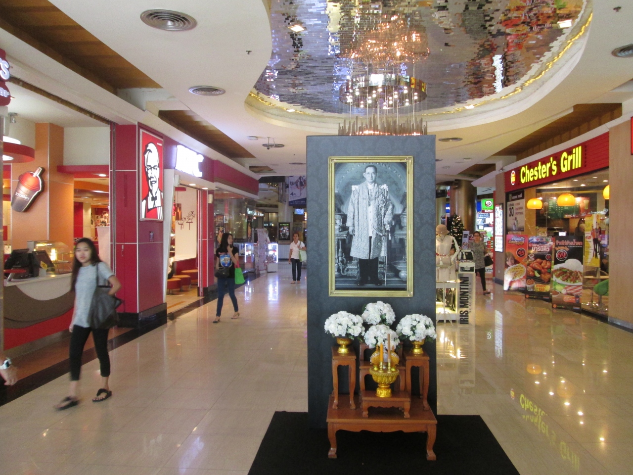 プミポン国王のご逝去に際して、街にはいつも以上に王様の写真を掲げているのが目立ちました。国を挙げての服喪期間となっており、メジャー シネプレックス スクンビットのエントランスには国王の写真が飾られていました。ショッピングプラザ自体は通常営業していましたが、店内では黒系の服が多く販売されていました。