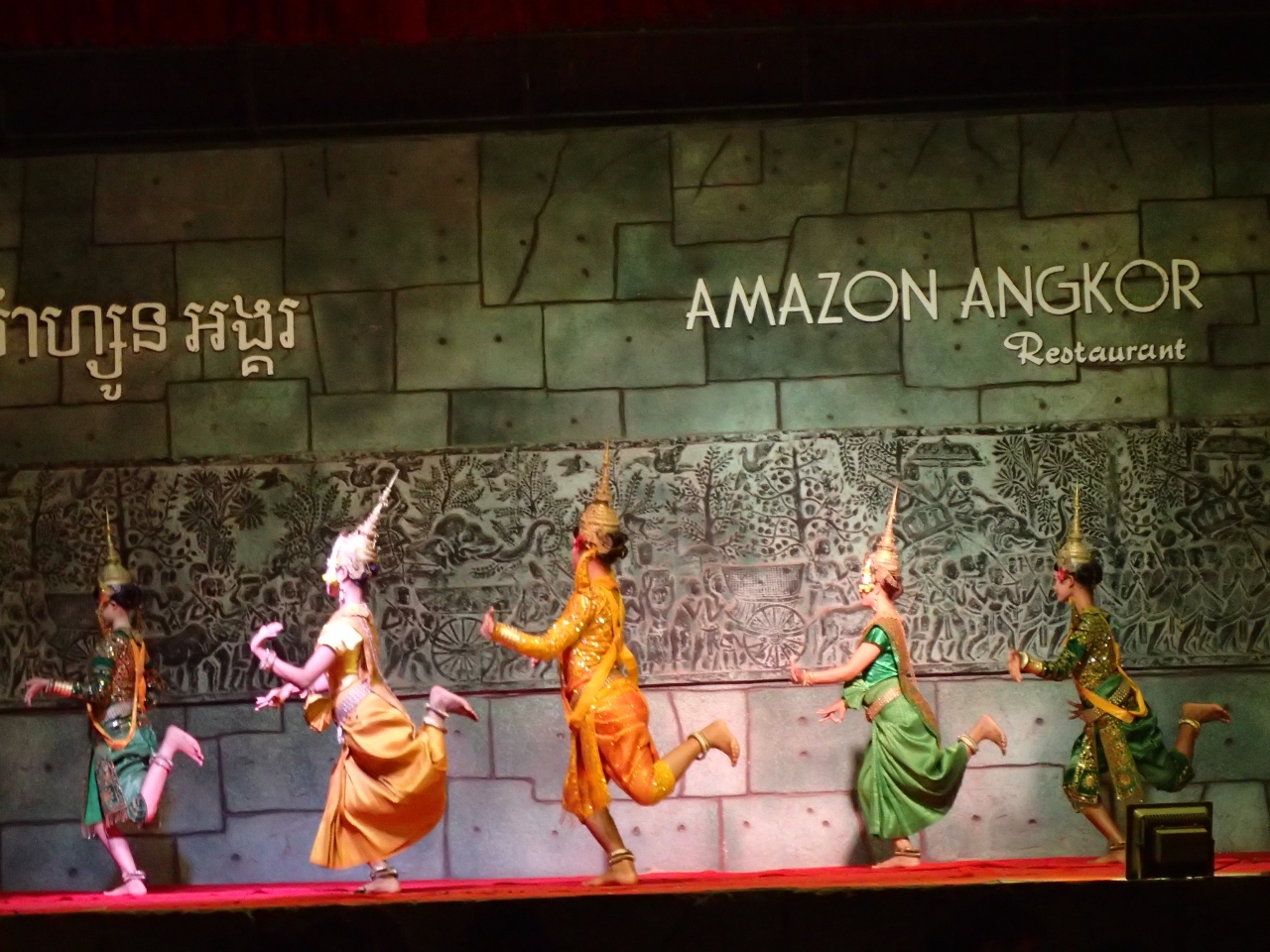 カンボジア料理はビュッフェスタイルで野菜が豊富で、鶏と魚を使った料理でした。タイ料理の様に辛くはなく、日本人には問題ないと思います。食事が終わる頃に踊りが始まり、漁師のダンスや有名なアプサラダンスを楽しみました。