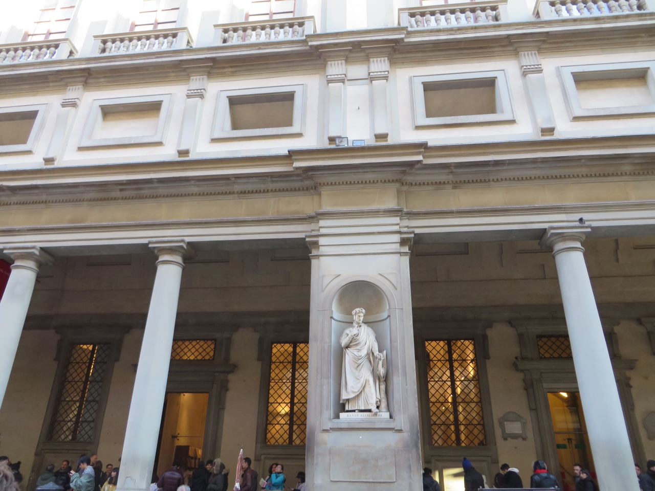 フィレンテェで一番賑やかなシニョーリア広場のすぐ隣にあるのがこの美術館。昼過ぎと夕方に行きましたが、ものすごい行列で、並ぶのは断念。事前にネットで予約していけばよかったと残念。美術館の前には、ダンテやミケランジェロなど数人の像が並んでいて、それだけでも見ごたえがありました。