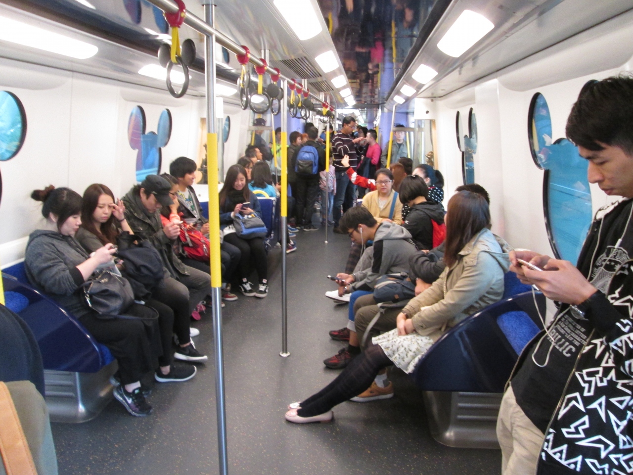 MTR迪士尼線は素敵な車内でした。中国系の人々は電車に乗ると座りたがりますので、迪士尼駅まで1駅なのですが、あっという間に座席が埋まってしまいます。しかし、この路線はつり革がミッキーなので非常にかわいかったです。