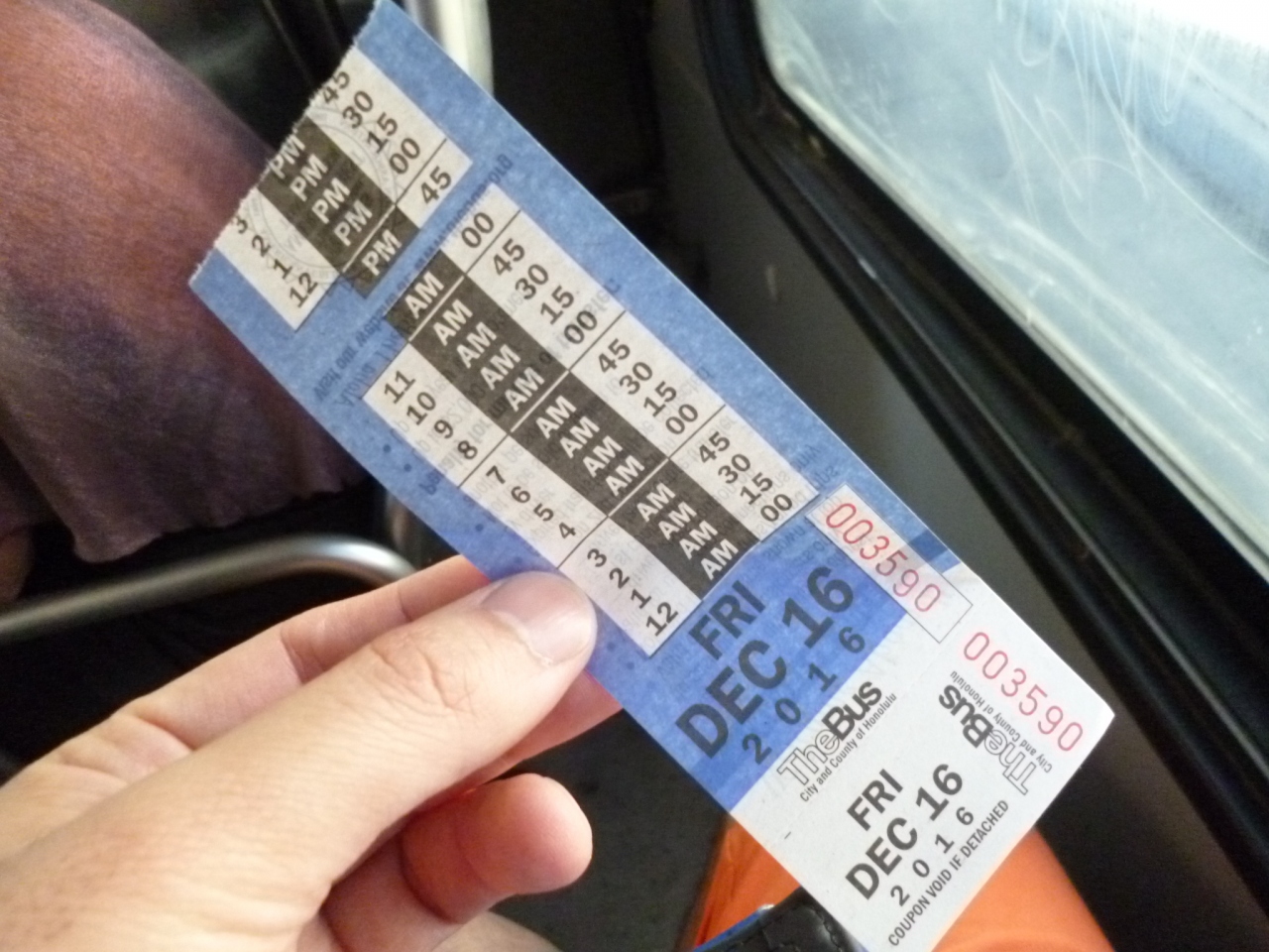 アラモアナからアリゾナメモリアル(=真珠湾)を訪ねる際に利用しました。人気路線は引っ切り無しにやって来ますが、空港およびアリゾナメモリアル方面は十数分に一本来るか来ないか。乗車時に運賃を支払います。紙幣だとお釣りがないからダメと断られ、アラモアナで買い物をして崩してから硬貨で再挑戦となっていまいました。次のバスに無料で乗り継げる乗車券をくれますが、これは復路に使ってもおとがめなし。捨てずにキープしましょう。