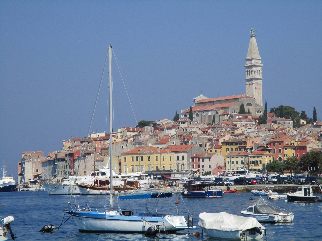 海岸通りです。ロヴィニ港を囲む通りで、この通りからグラスボードが出発します。この通りを歩いていると、とても風が気持ちいいです。何よりも丘の上にそびえる聖エウフェミヤ教会を中心に広がる旧市街の景色は、ここから見るのが一番です。