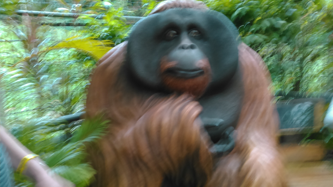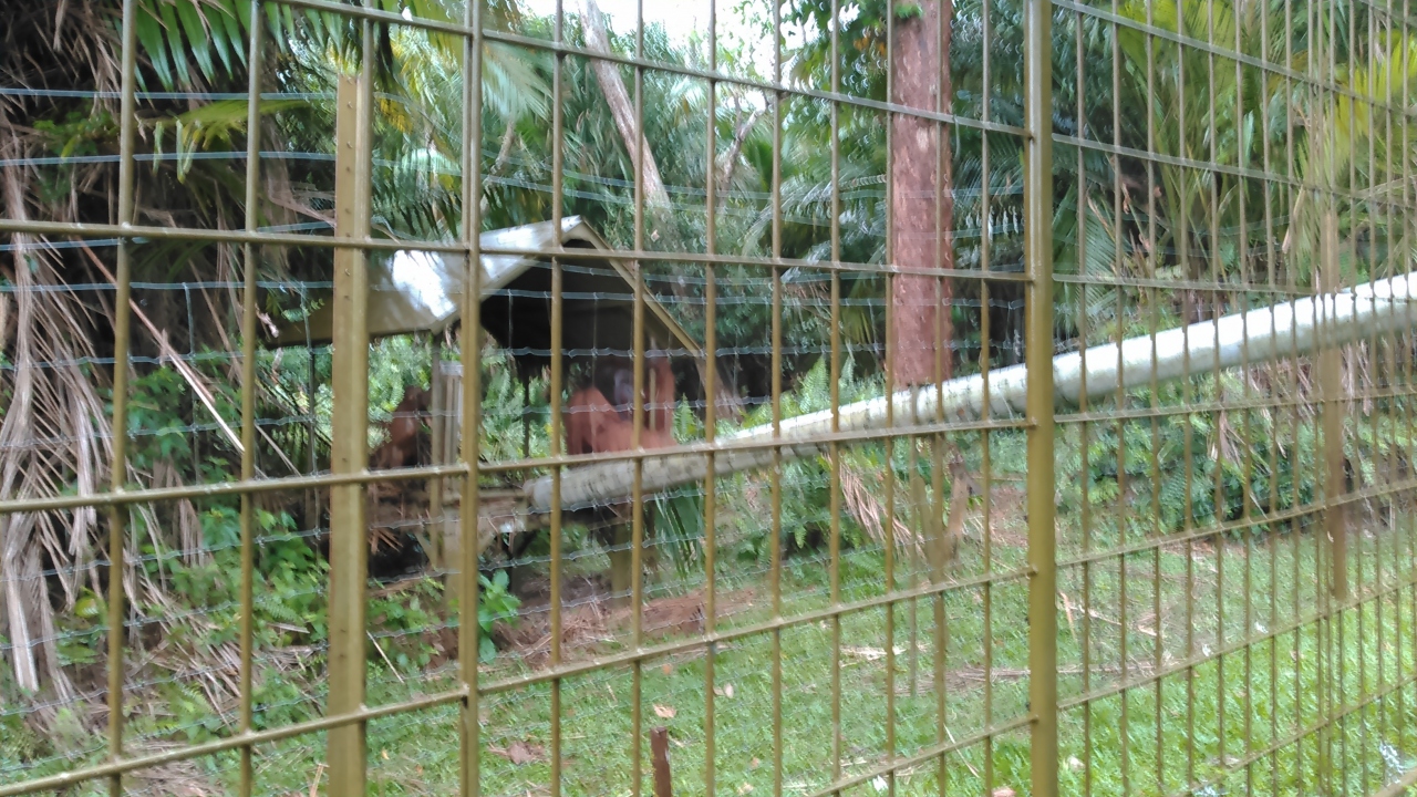 ツアーで訪問しました。ブキットメラに着いて、観光バスを降り、ボートに乗り換えて、約10分、保護島へ。激しいスコールを船着き場でやり過ごしました。檻の中に入り、オランウータンに見られます。母と子、大人の雄、子供たち・・・両手を挙げるとジュースが貰えるのを学習し、ちゃんとやってみせてくれ、ジュースを貰って飲んでいました。