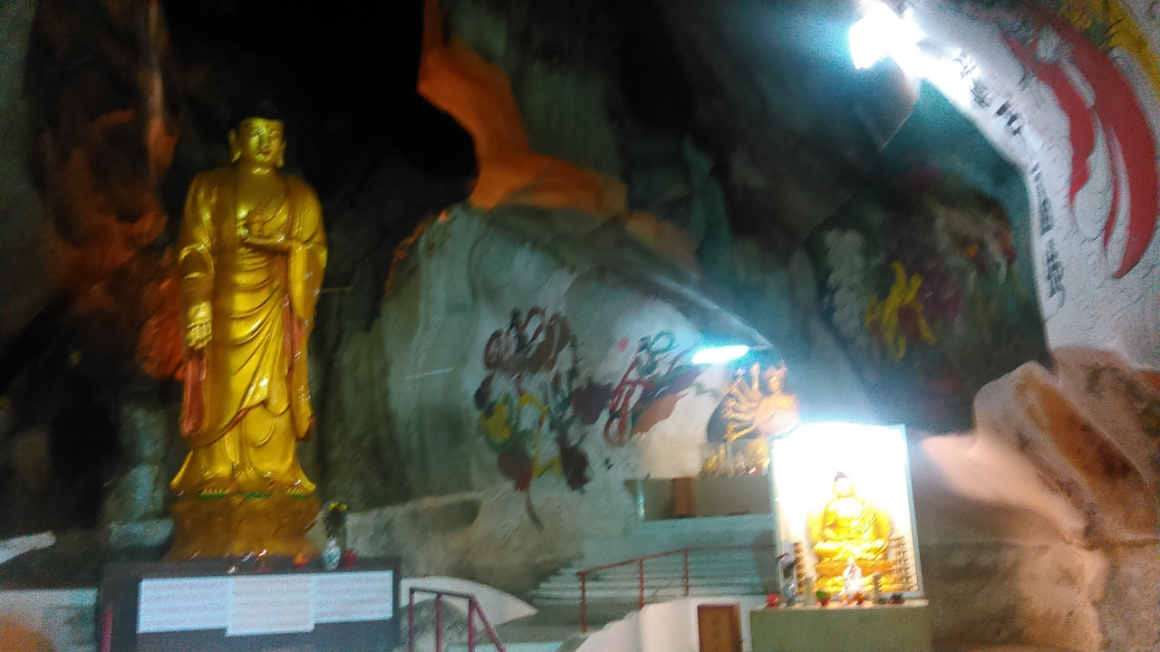 ツアーで訪問しました。イポー市街の北約6kmの洞窟の中にあるので、涼しいお寺です。中央には高さ12.8mの観音仏が鎮座してます。岩山の山頂(122m)へ続く385段の石段を登やく10分かけて登った方たちもいました。壁には天女や菩薩などが描かれています。