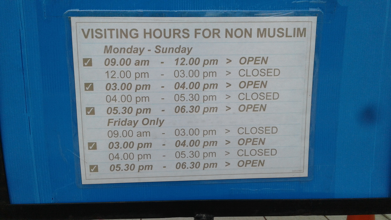 クアラルンプールの国立モスクは、KTMコミューターのクアラルンプール駅の正面から行く場合は、駅前の地下道を通って道の反対側に出ると便利です。クアラルンプール駅の北口の方が近いですが、少し分かりにくいです。モスクはとても美しく、観光にお薦めですが、女性は肌の露出を避けてください。女性はモスクの入り口でローブを貸してくれます。礼拝時間の間は観光できないので注意してください。