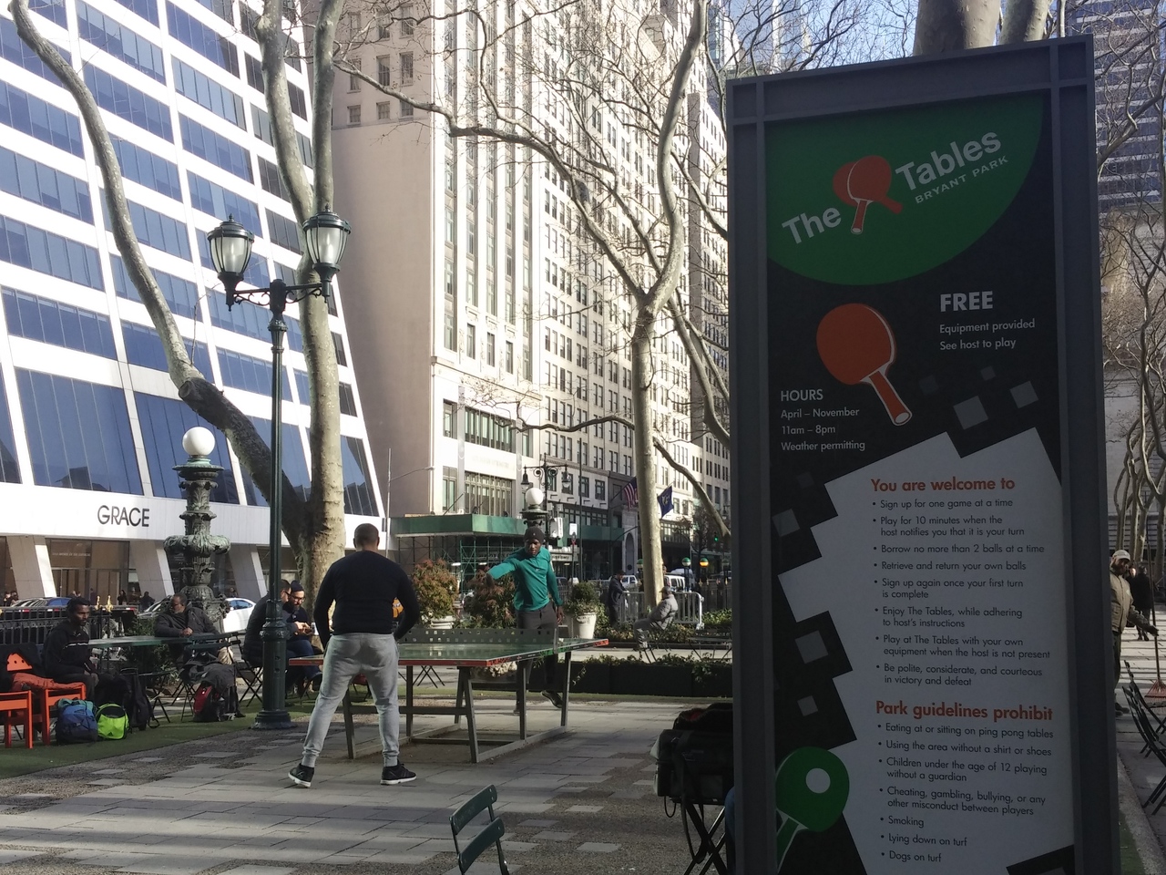 グランドセントラル駅からすぐの公園。冬にはスケート場が出現、回りにはショップやカフェがあります。フリーの卓球もあり、ほっとした雰囲気!高層ビルに囲まれながら地元の人がゆっくりと楽しむ、ニューヨーク独特の雰囲気が味わえる癒しの公園です