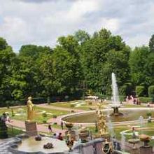 ペテルゴーフで有名な大宮殿前から続く階段テラスの大滝を下って行き、左側に見えてくる噴水がイタリアの噴水です。シンプルな噴水で大滝に比べると若干地味ですが、周囲は芝生とお花がきれいに整備されていてきれいです。右側には同じような噴水がありますが、こちらはフランスの噴水という名前です。