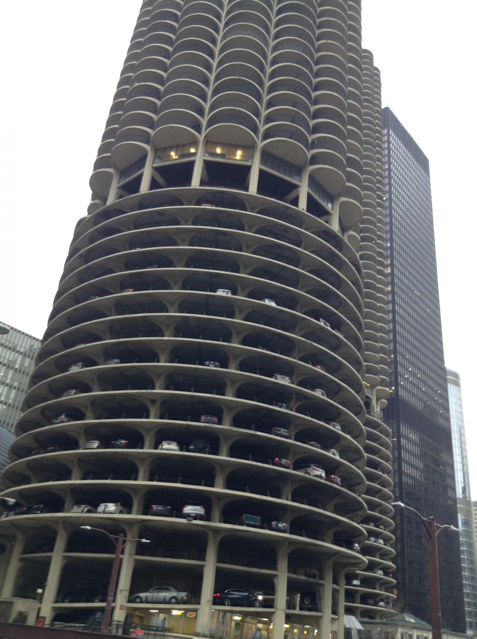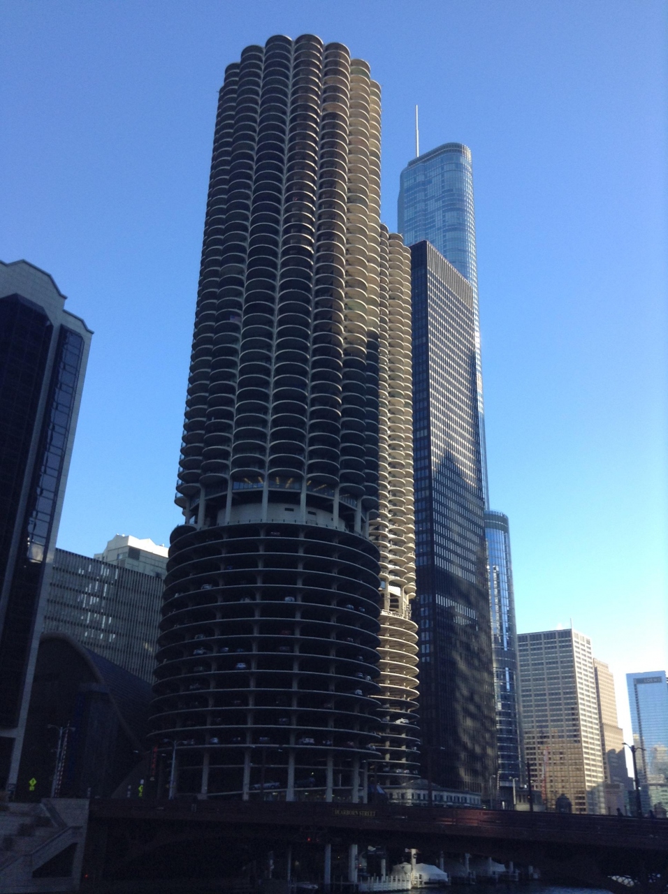 シカゴ川周辺にある2つのトウモロコシの形をしたタワー。建物の下の方はパーキングで、車が止まっているところが見えます。移動する時にいろんな角度から楽しめました。ジョンハンコックからも見えました。ユニークで見つけやすいと思います。