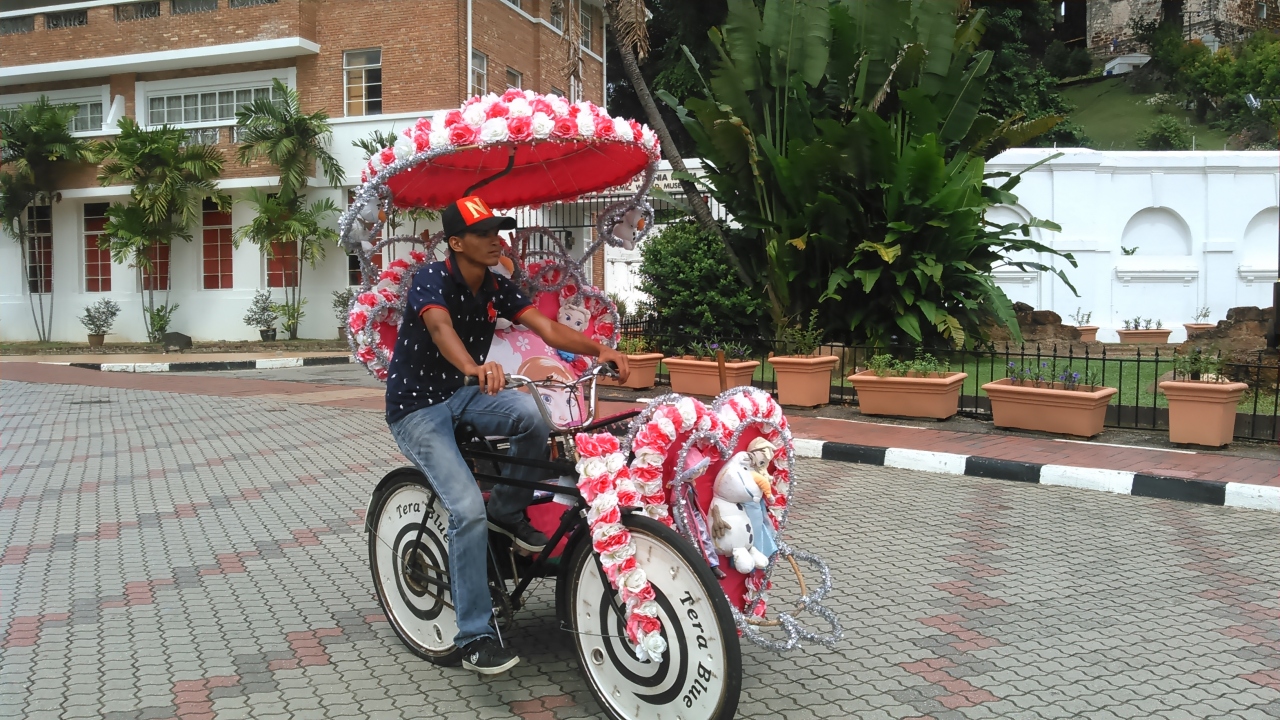 マラッカのオランダ広場周辺に沢山います。観光客が沢山いるので、利用者も多いのでしょう。サンチャゴ砦の横の舗装道路でも沢山走っていました。キティーちゃんやアナと雪の女王など、キャラクターものもあります。自転車が横で、お客が隣という並んで走るタイプ、ベトナムのシクロとは違います。