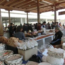 大きな市場で、野菜、米、蜂蜜など商品ごとに