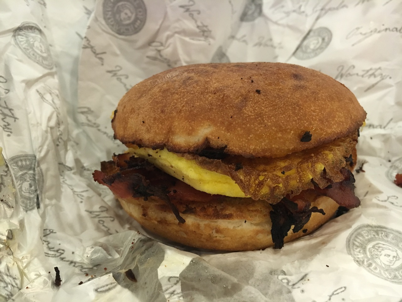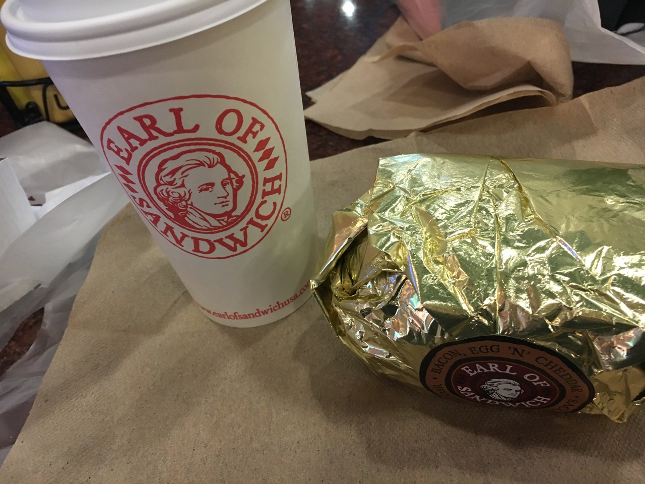 朝8時過ぎに行きました。いくつかあるブレックファーストメニューから選びました。具材が書いてあるので分かりやすいです。注文するところ、支払い、受取する場所が別れています。受取りはベルが鳴ったら取りにいきます。