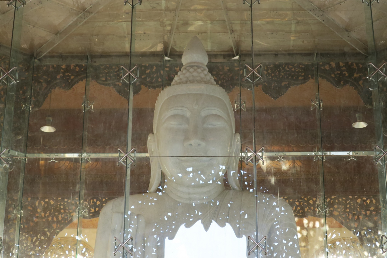 大きな大理石が出た、ということで作られた大理石の大仏です。囲いが反射して見えづらかったので、これがなければもっとよかったです。この大仏の側に囲われていない小さめのお坊さんの像があります。これも大理石でできてました。