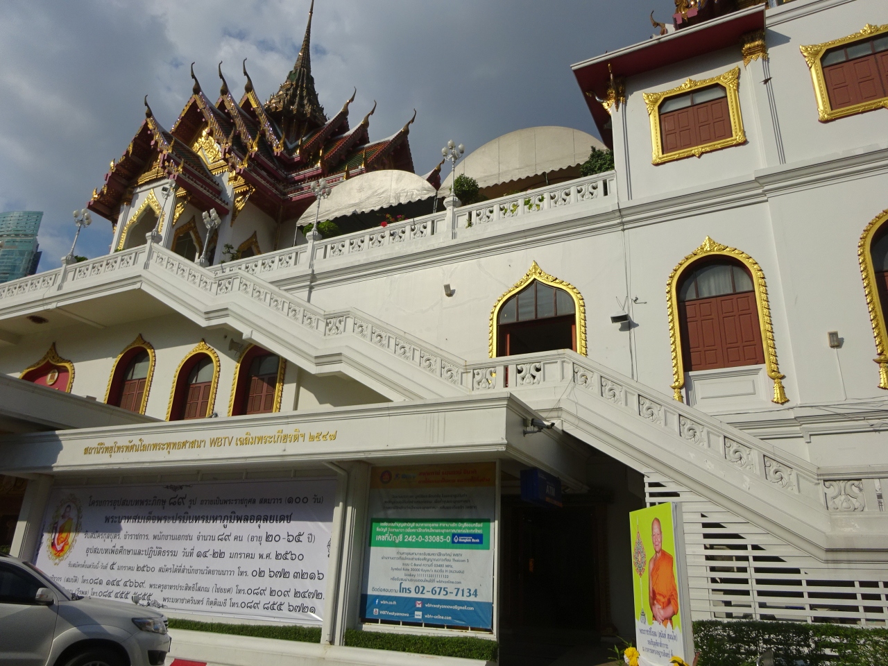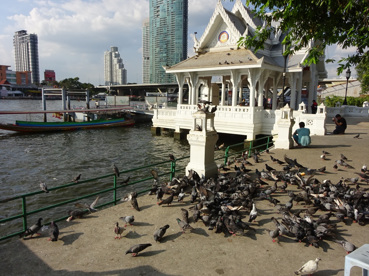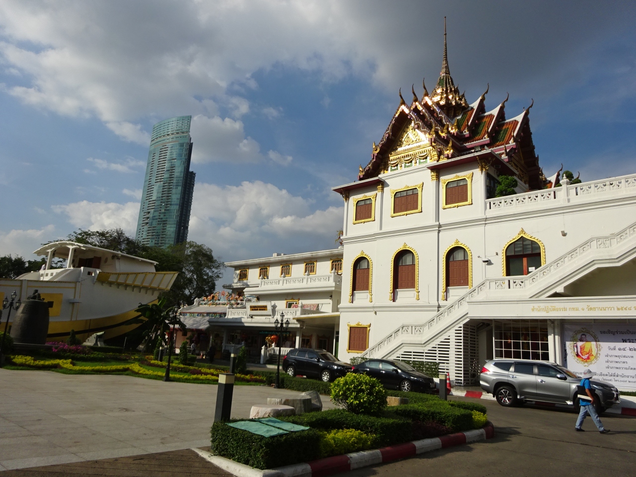 BTSのサパーンタクシン駅からチャオプラヤ川の下流側100mくらいのところにあります。歩いて3分くらいです。アユタヤ王朝時代のお寺で、バンコク唯一の船の形をしています。バンコクの寺には犬や鬼などの神様がいますが、この寺では見かけませんでした。砲台が左右にありました。船の後方から船の中へ入ることができます。観光客がほとんどいないので少し緊張しました。隣接するチャオプラヤ川には魚がたくさん集まっていて、餌をあげている人がいて魚がたくさん飛び跳ねていました。