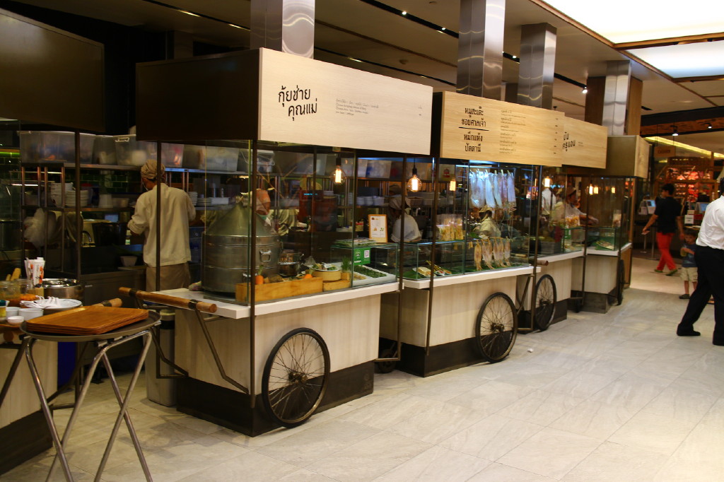 入口で配られる大きめのカードに利用した店で記録してもらい最後に出口で精算するシステム、カードはVISAかMASTERが利用可。ショップはたくさんあり席数もたっぷりありナイフとフォークがセットされていて清潔感があるので安心して利用できた。料理の種類がたくさんあるので何日かいってもあきないで利用でき、またお土産用のものも売っている。