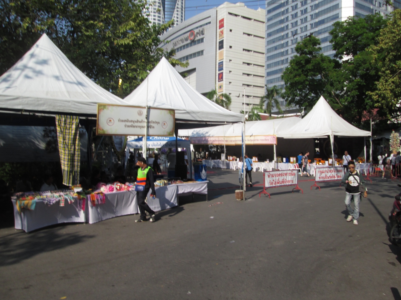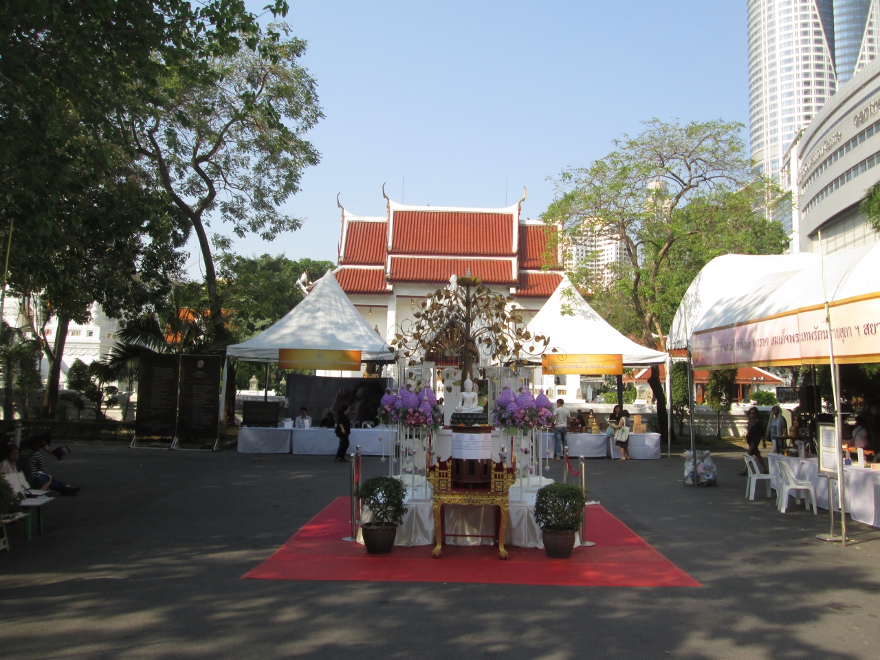 ワットパトゥムワンナラームは普段は静かな寺院です。2月11日はマカブーチャ(万仏節)という祝日で、境内では特別なイベントを開催していました。バーツの紙幣を付けたお供えが置いてあり、一種のお祭りのようないつもとは異なる雰囲気でした。
