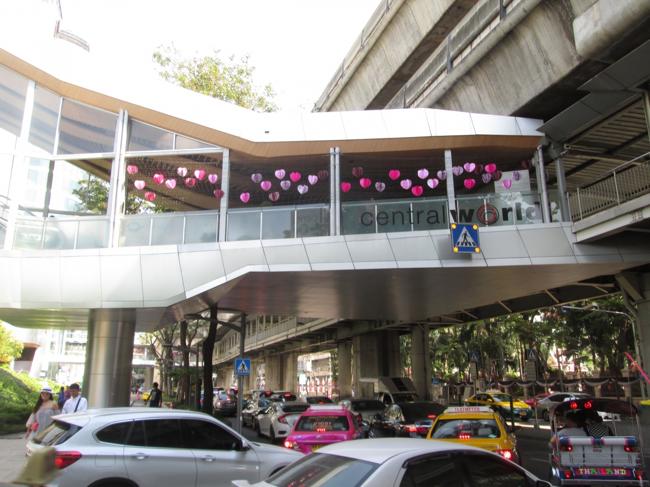 バレンタインシーズンのスカイウォークにピンクのハートの飾りが付けられていました。日本とは異なり、タイでは男性が女性のためにプレゼントを買って送る習慣になっているようです。サイアム、チットロムのショッピングセンターでは関連するギフトが販売されていました。