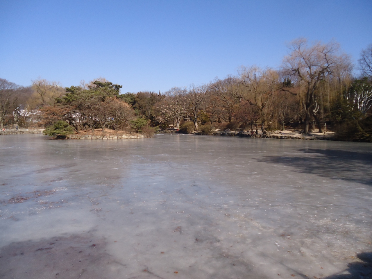 昌慶宮の庭園にある池で瓢箪型の池の上側になるのが小春塘池です。すぐ近くには温室があって昔植物園だったということがわかるようですが、私が行った時にはこの池のところからも工事中というのが見えてちょっと断念な雰囲気でした。池も凍っていて寒さを感じただけでした。