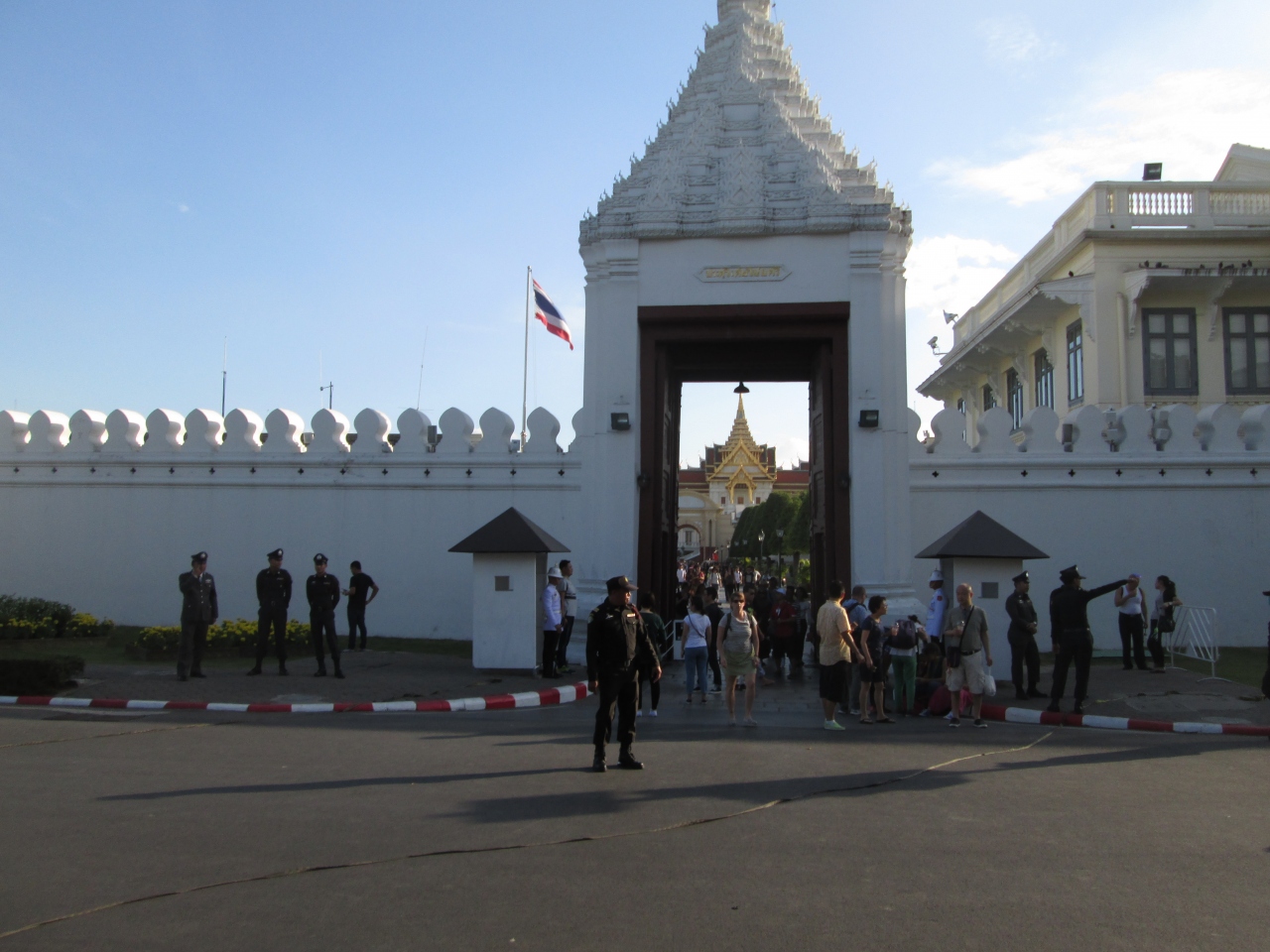 プミポン国王の崩御に伴い、入場観光が制限されていた王宮、ワットプラケオですが観光客に対する開館を開始していました。国王の遺体が安置されている王宮内のドゥーシットマハープラサート殿に向かう一般弔問の列に並んでいるときに敷地内で観光客を見かけました。弔問する際には黒いシャツにパンツを履いて、地味目のかばんを持参していきましたが、観光客はハーフパンツやTシャツのスタイルの服装が多かったです。