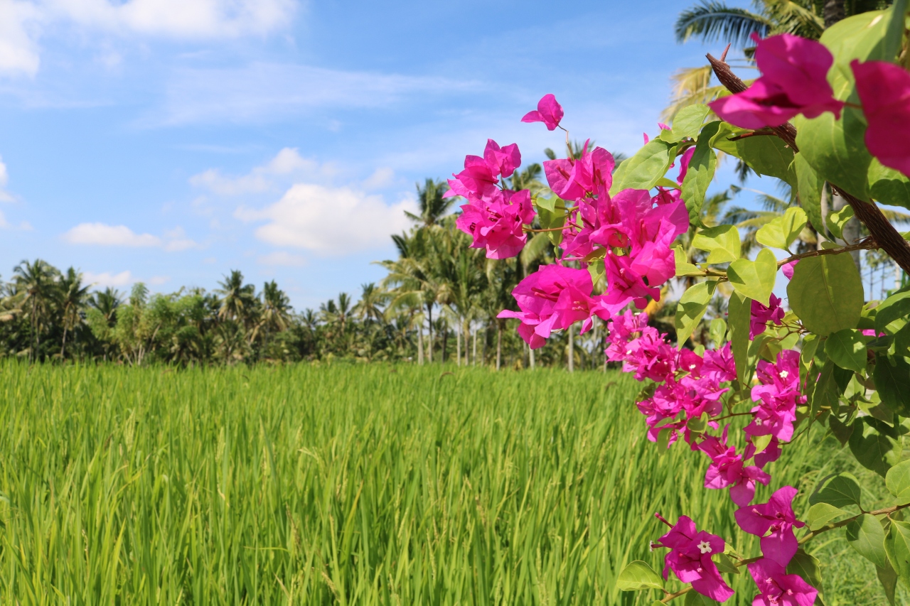 ジャラン・カジェンを500mほど北上すると急に道が開けて、田園地帯が目の前に飛び込んできます。美しい景色の連続で、日ごろのストレスや疲れがす~っと消えていくのがわかります。なんてことない風景の中にどこか懐かしさを覚えるのは、やっぱり日本人だからかでしょうか。
