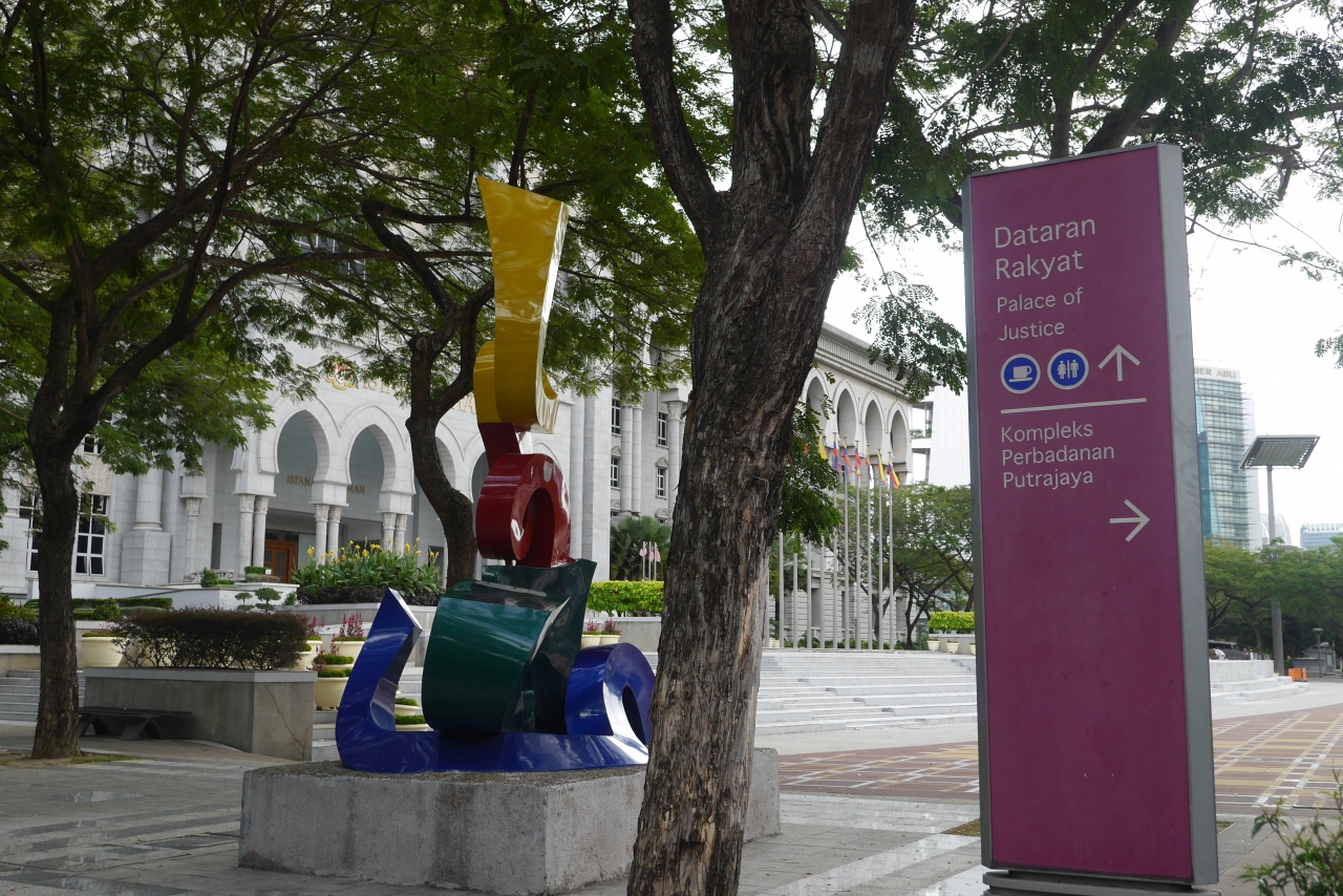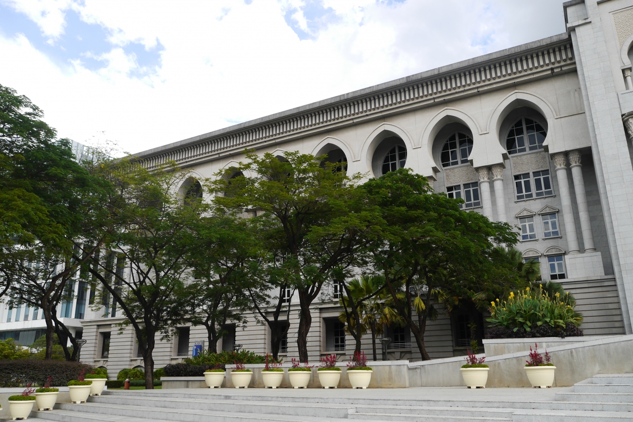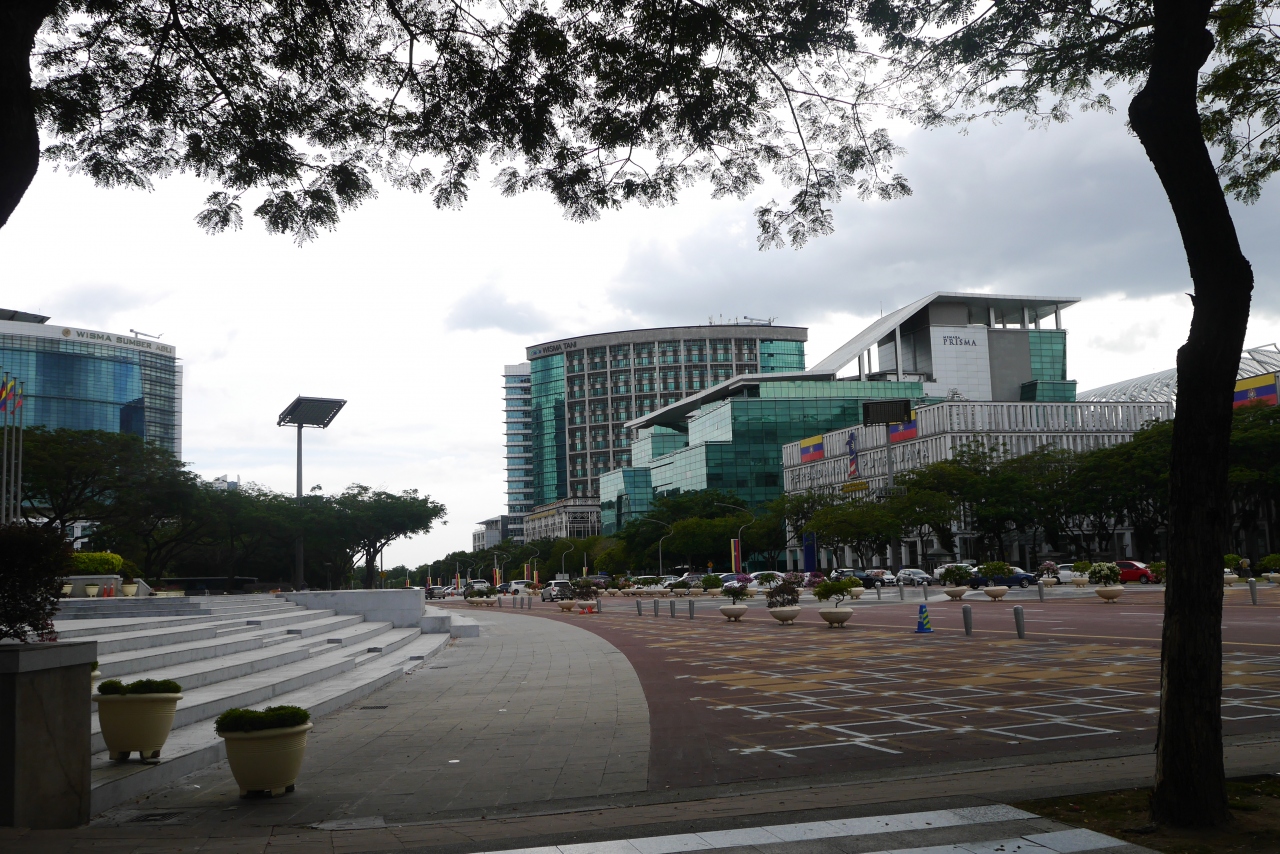 プトラジャヤには多くの中央官庁がありますが、その中でも大変目立つ建物です。メイン通りにあり、モスクのようなドームと神殿を思わせる柱列が目を引きます。淡いピンク色も使われていますが、威厳を感じる建物です。目の前の通りは広く整備され、適度に植木も置かれ、明るい雰囲気を出しています。訪問時は土曜日で官庁は休みだったので人通りは少なく、ゆっくり見学できました。