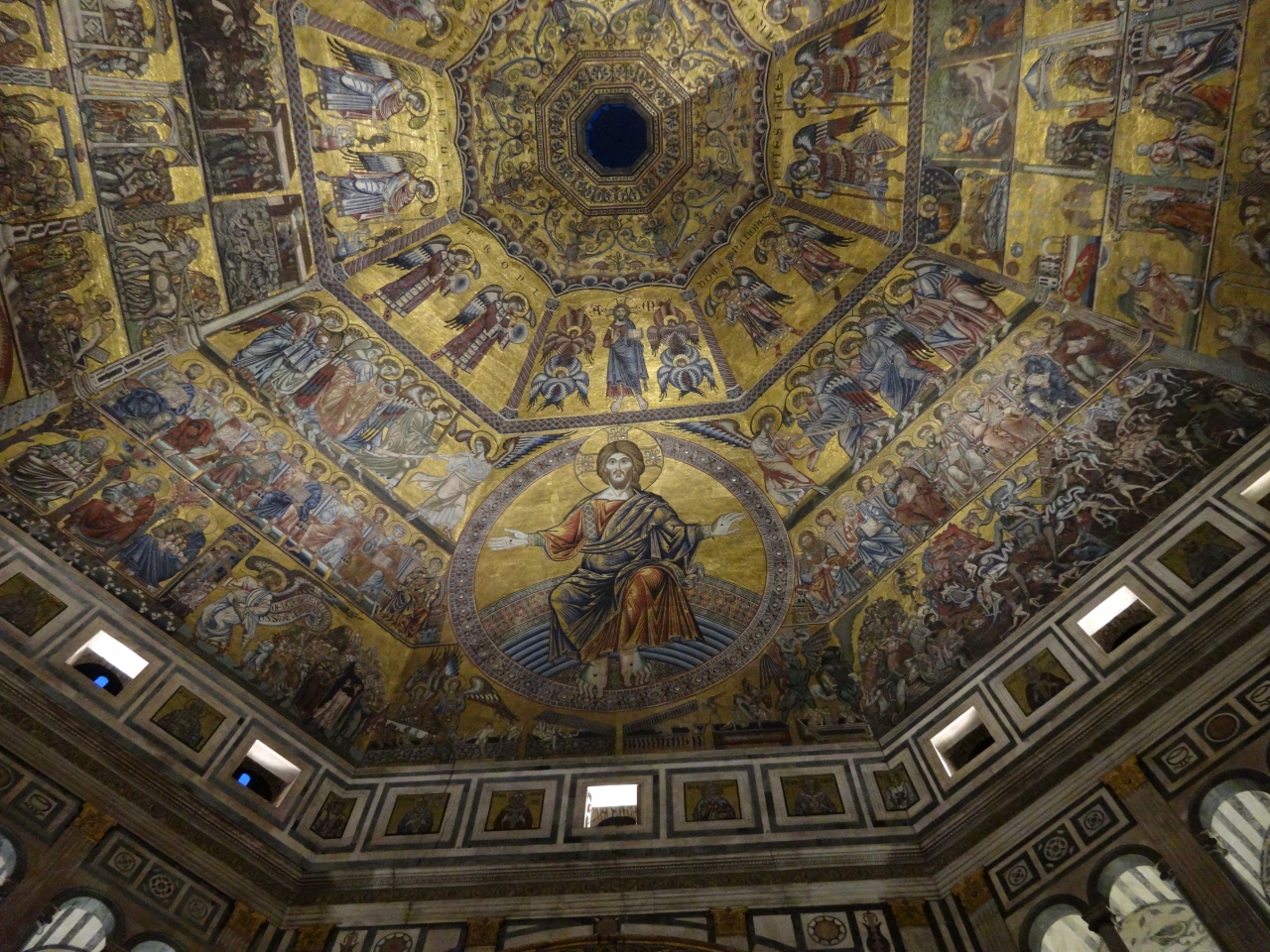 ドゥオモやジョットの鐘楼との共通券(15ユーロ)で入りました。ビザンツ様式のモザイクに影響されたという天井のモザイクが金色に輝いていて目を引きます。天井下の柱廊の通路の奥の壁には、白黒で鳥や花などの模様が描かれていて、その部分も面白いです。
