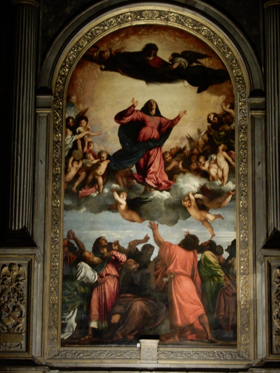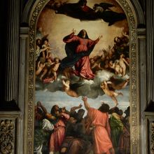 外観からは想像できないほど、内部は見どころが多い教会です。聖歌隊席の立派さにも驚きましたが、その奥にこの教会の至宝、ティツァーノの「聖母被昇天」があり、とても存在感がありました。小さい祭壇画ですが、「聖母と諸聖人」の三幅画の中央の聖母の優しそうな姿も印象に残りました。