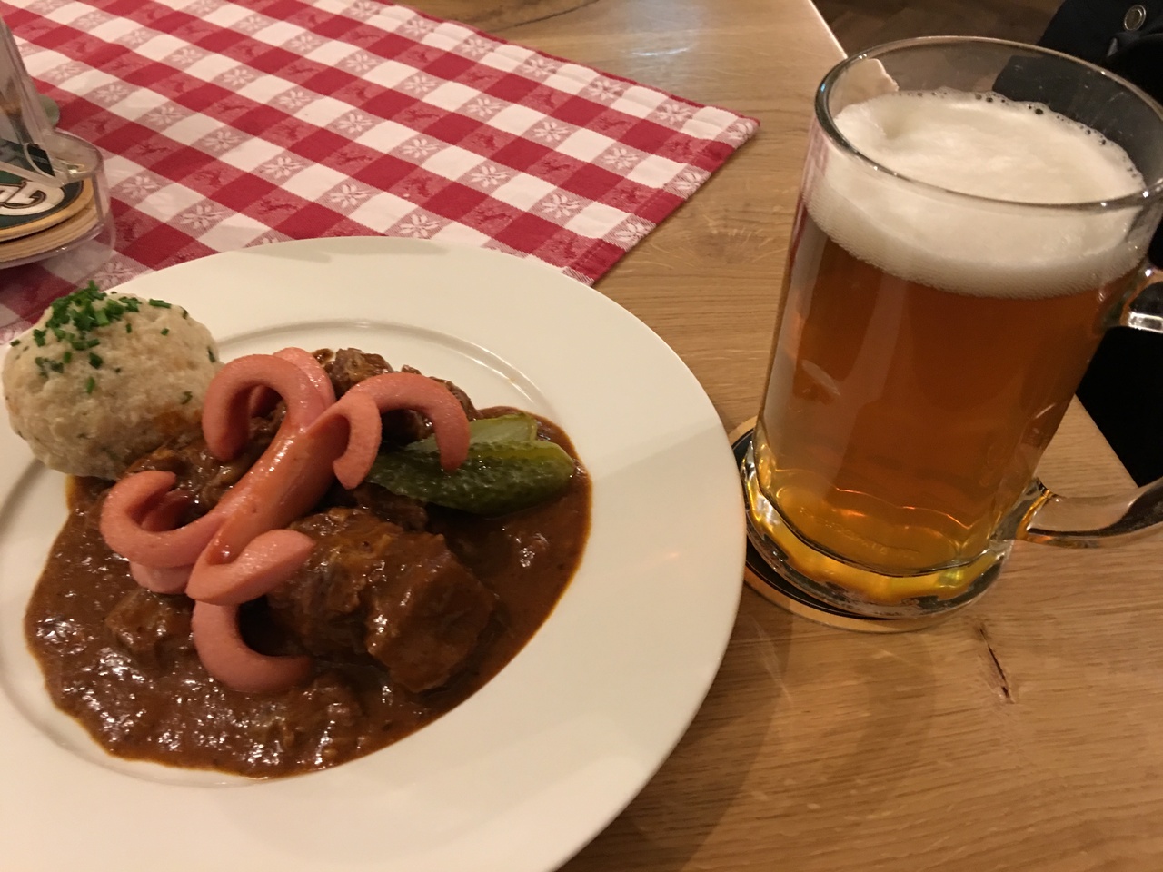 ザルツブルクのゲトライデガッセにあるレストランです。メニューが外に張り出されてあって、手頃な値段だったので夕食を摂りました。いただいたのはグラーシュとオリジナルビール。グラーシュは牛肉が柔らかく煮込まれており、お腹にするする入ります。付け合わせがポテトかと思ったら、クネドリーキだったのもグッド!