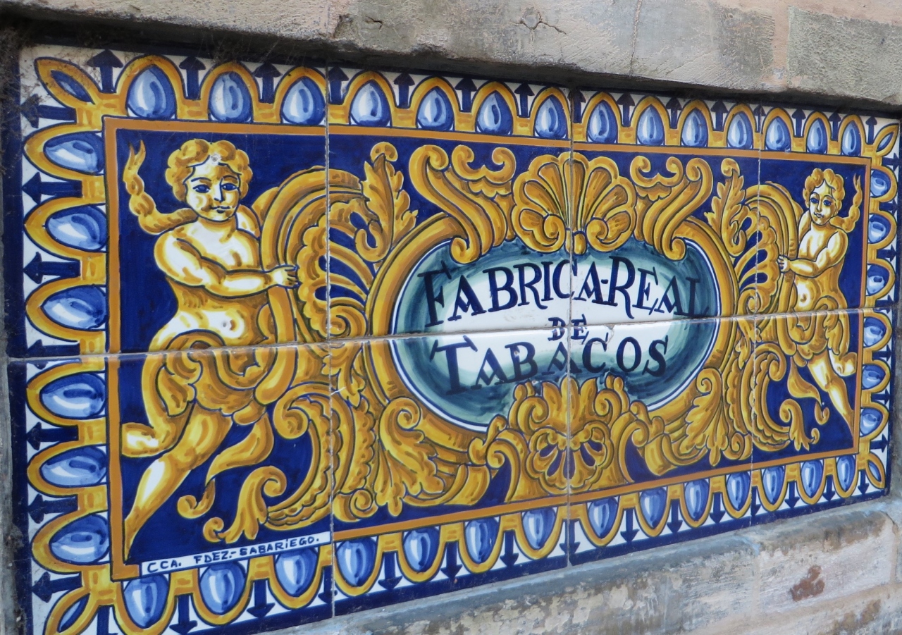 ファサードの入り口上部には「Real Fábrica de Tabacos 」(王立タバコ工場)とデコラティブな表示があります。