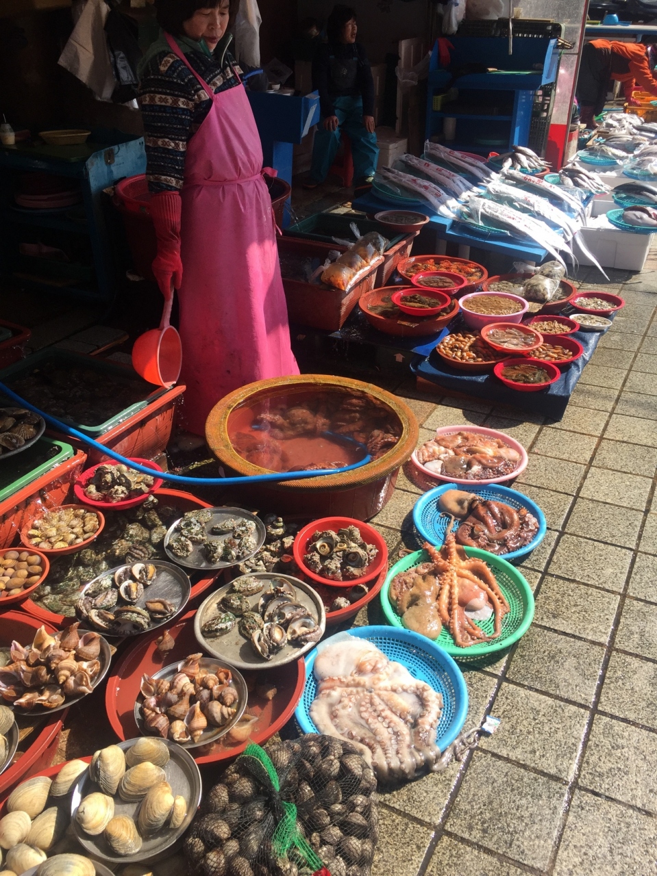 港町釜山の台所です。釜山近海で取れた海産物であふれています。港沿いに食堂が多数あり、タコの踊り食いやホヤ、ナマコ、アワビ、ヌタウナギなどが食べられます。非常に活気があり、歩くだけでも楽しいです。地下鉄の駅からも近いのでアクセスも◎です。