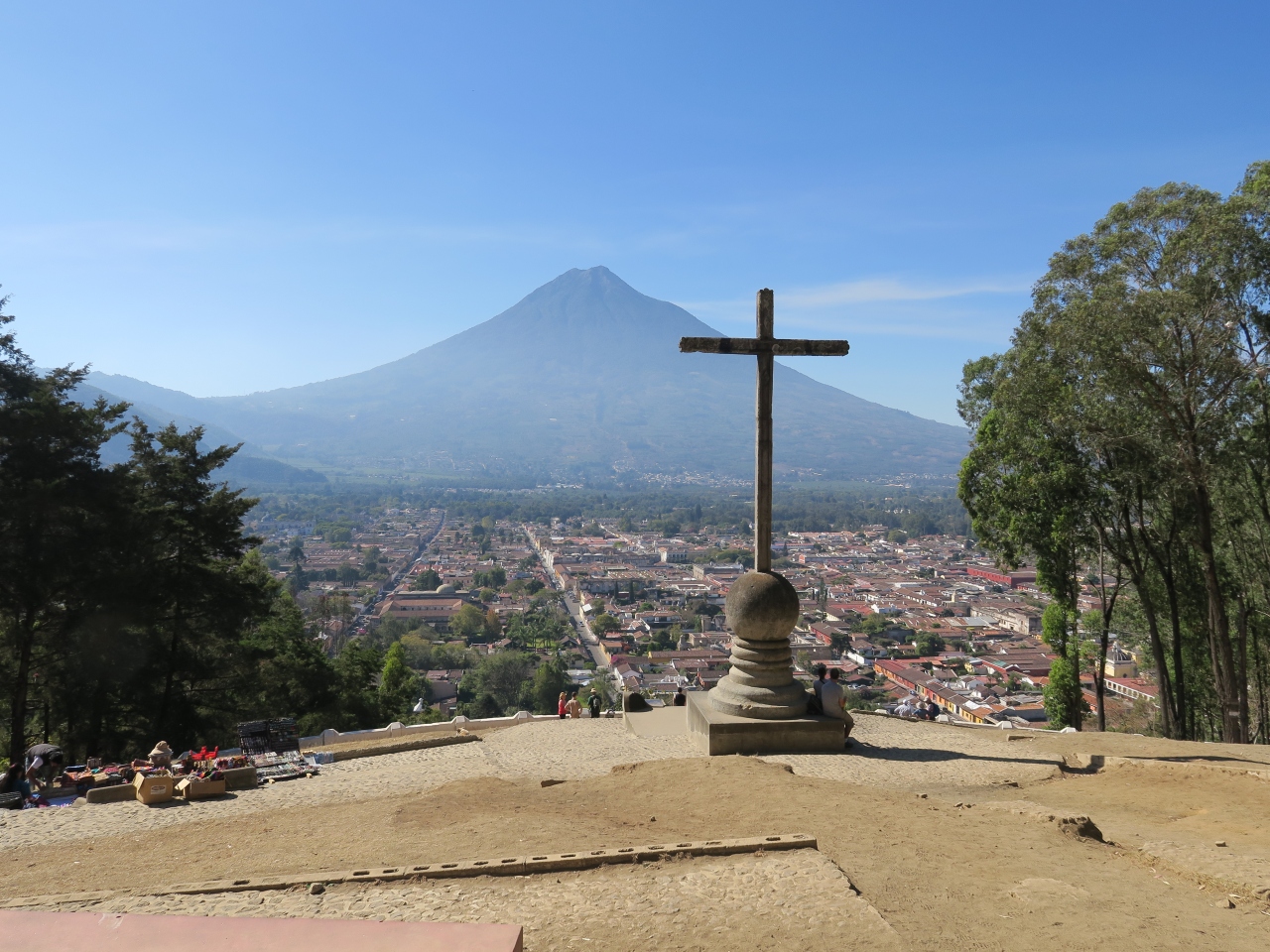 アンティグアの街の北側に位置する丘の上から、街を一望することができます。丘の上に大きな十字架が建てられていて、十字架の丘と呼ばれているようです。当日は、天気の良い日で、遠足の子供たちも来ていました。山々に囲まれたコロニアル調の街を眺められるこの場所は、是非訪れて欲しい場所です。