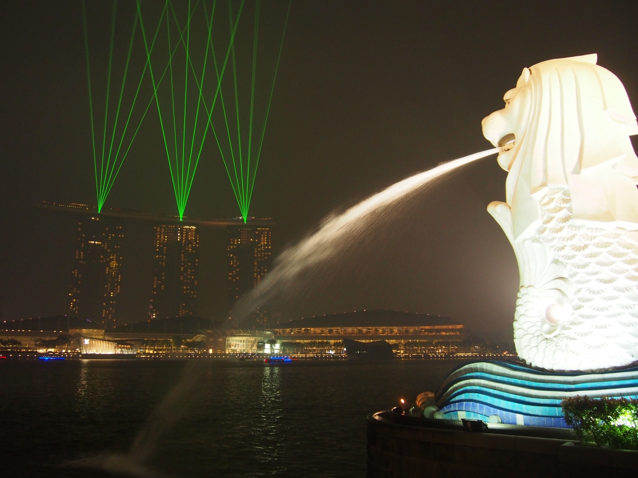 昼のマーライオンも良いですが、夜はライトアップとマリーナ・ベイ・サンズの光のショーを楽しめます!!